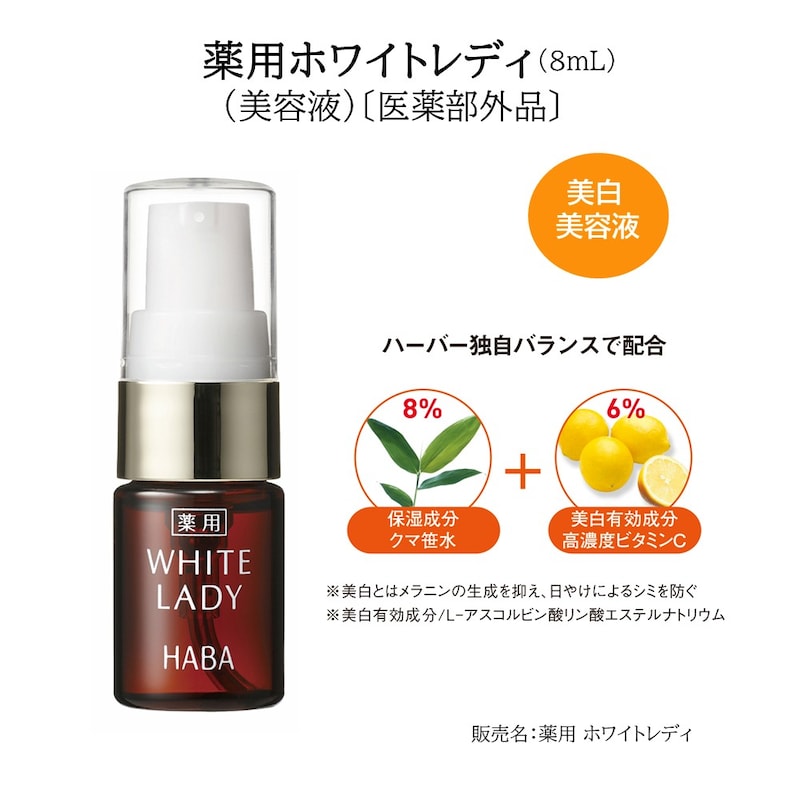 HABAでロングセラーを誇る美白美容液(※)「薬用ホワイトレディ」のミニサイズが付いてきます。