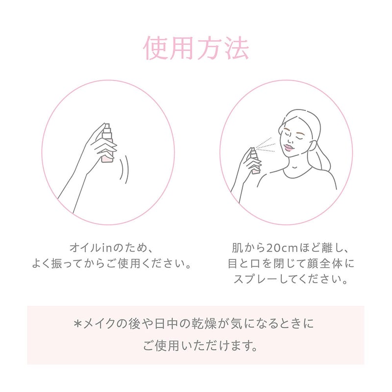 ●オイルインのためよく振ってからご使用ください。肌から20〓ほど離し目と口を閉じ顔全体にスプレーしてください。