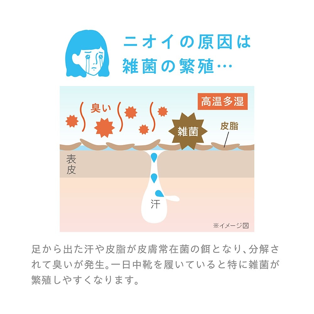 足特有のニオイ成分「イソ吉草酸」の発生を抑え、足臭を長時間消臭。