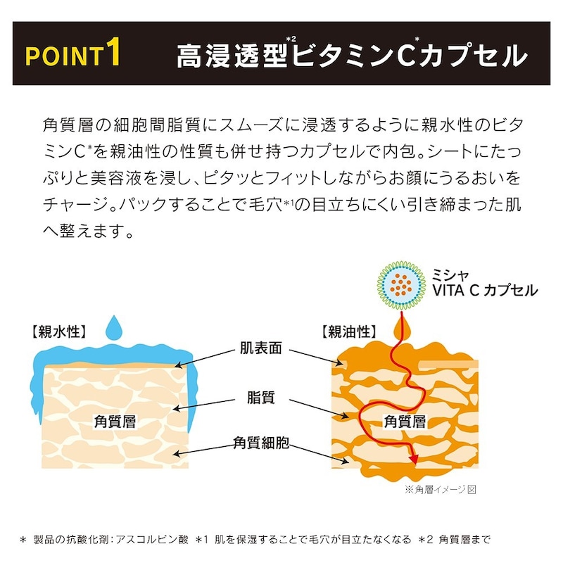 成分が角質層へスムーズに浸透するよう、ビタミンCをカプセルで内包している点が特長です。