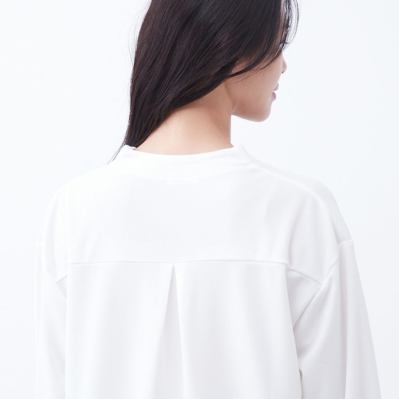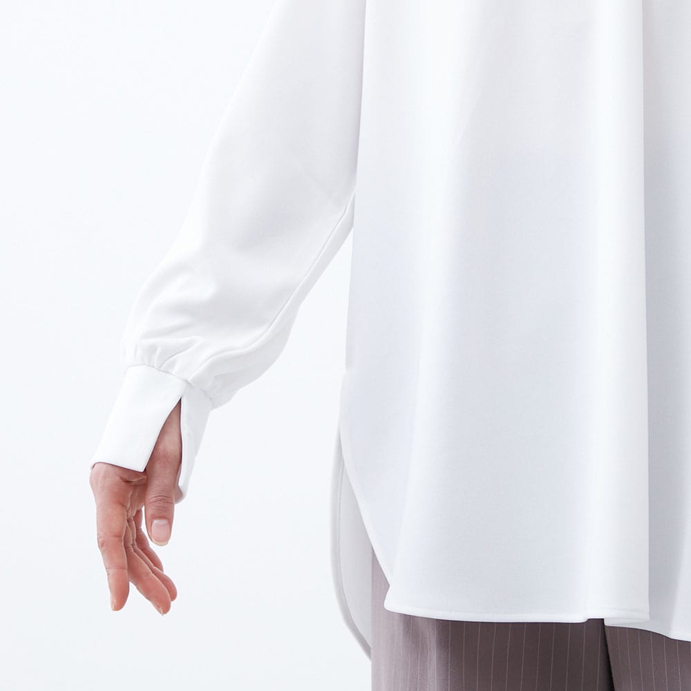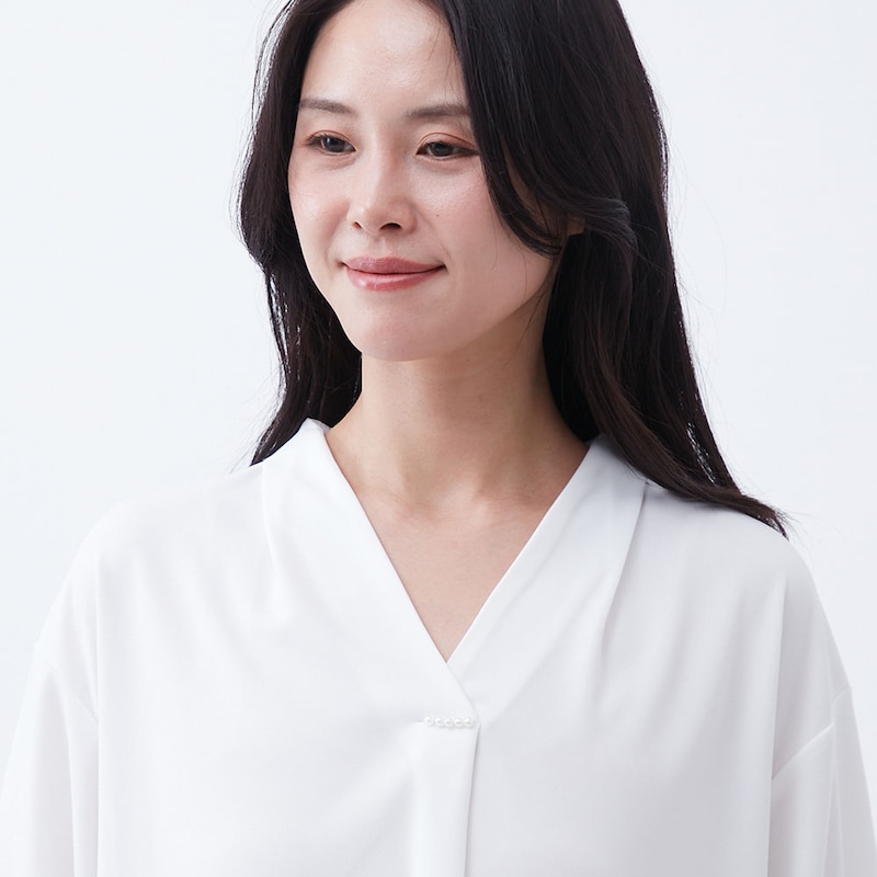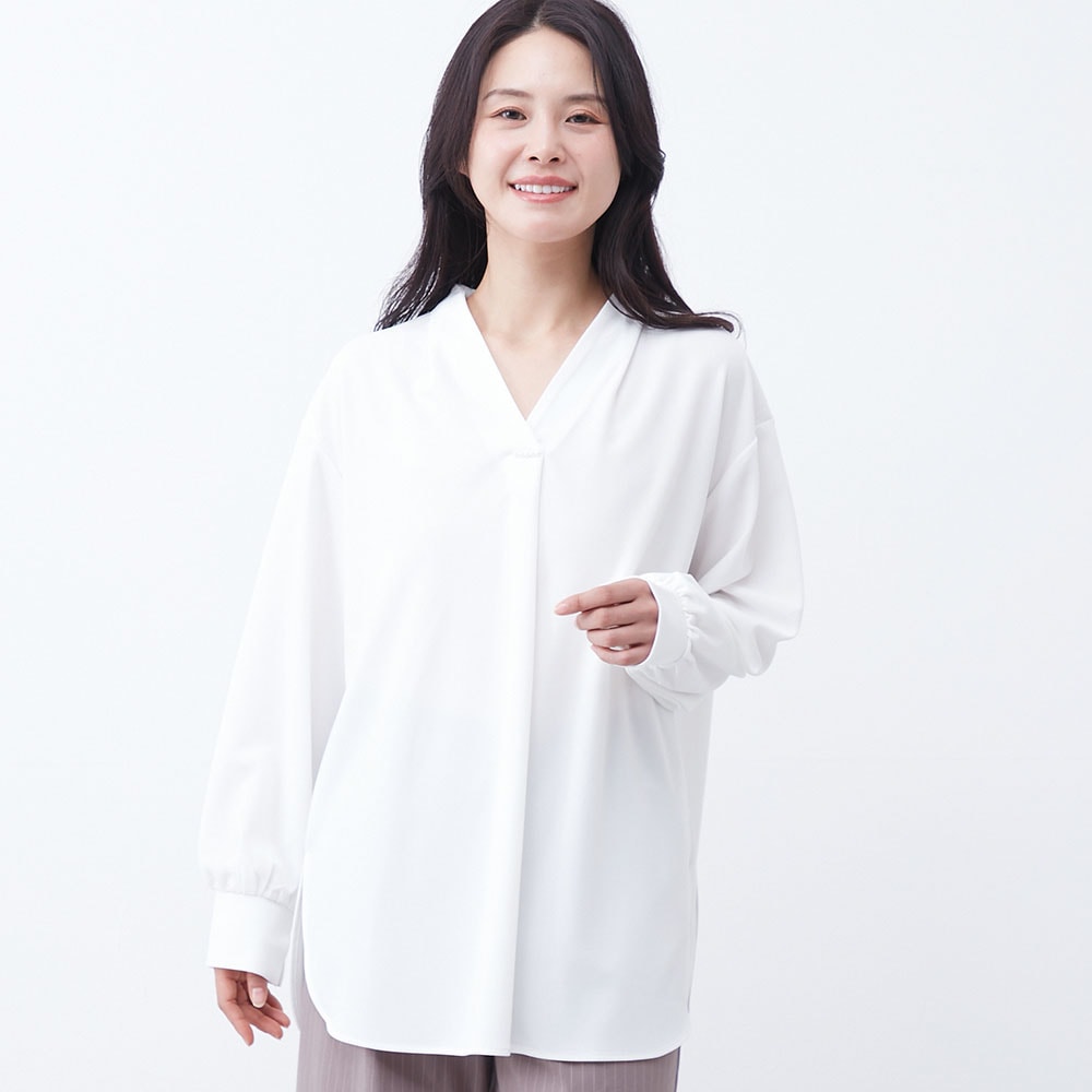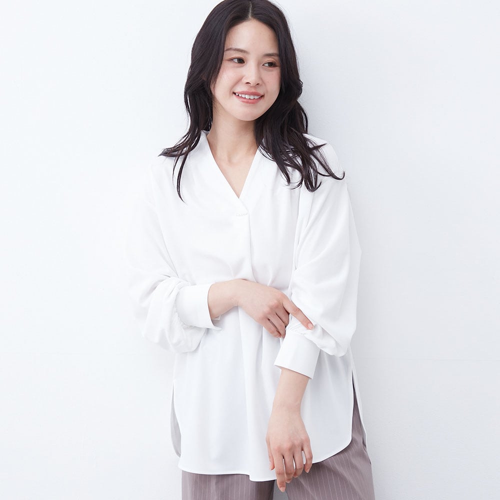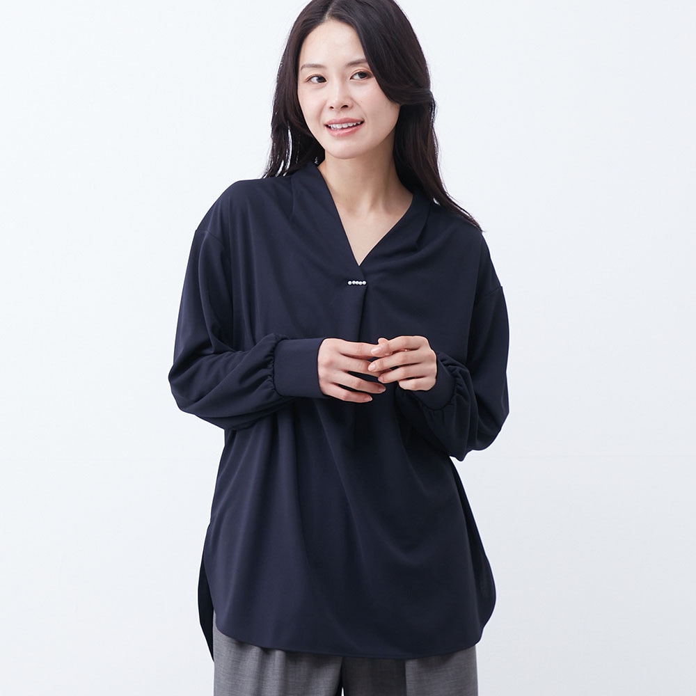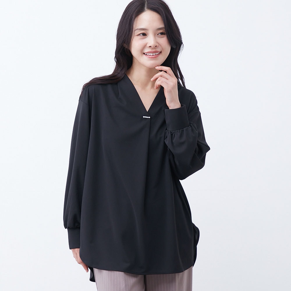 胸元のパールが上品な、Vネック仕様のタック入りチュニック