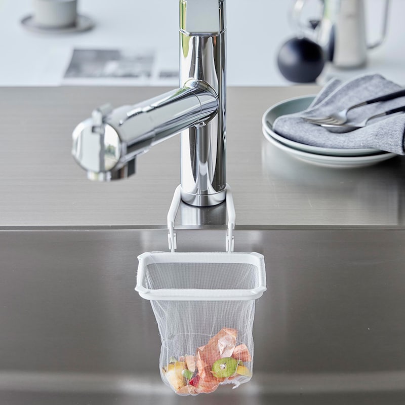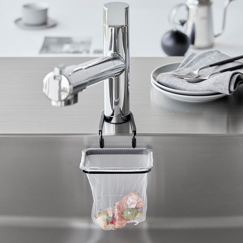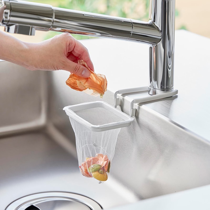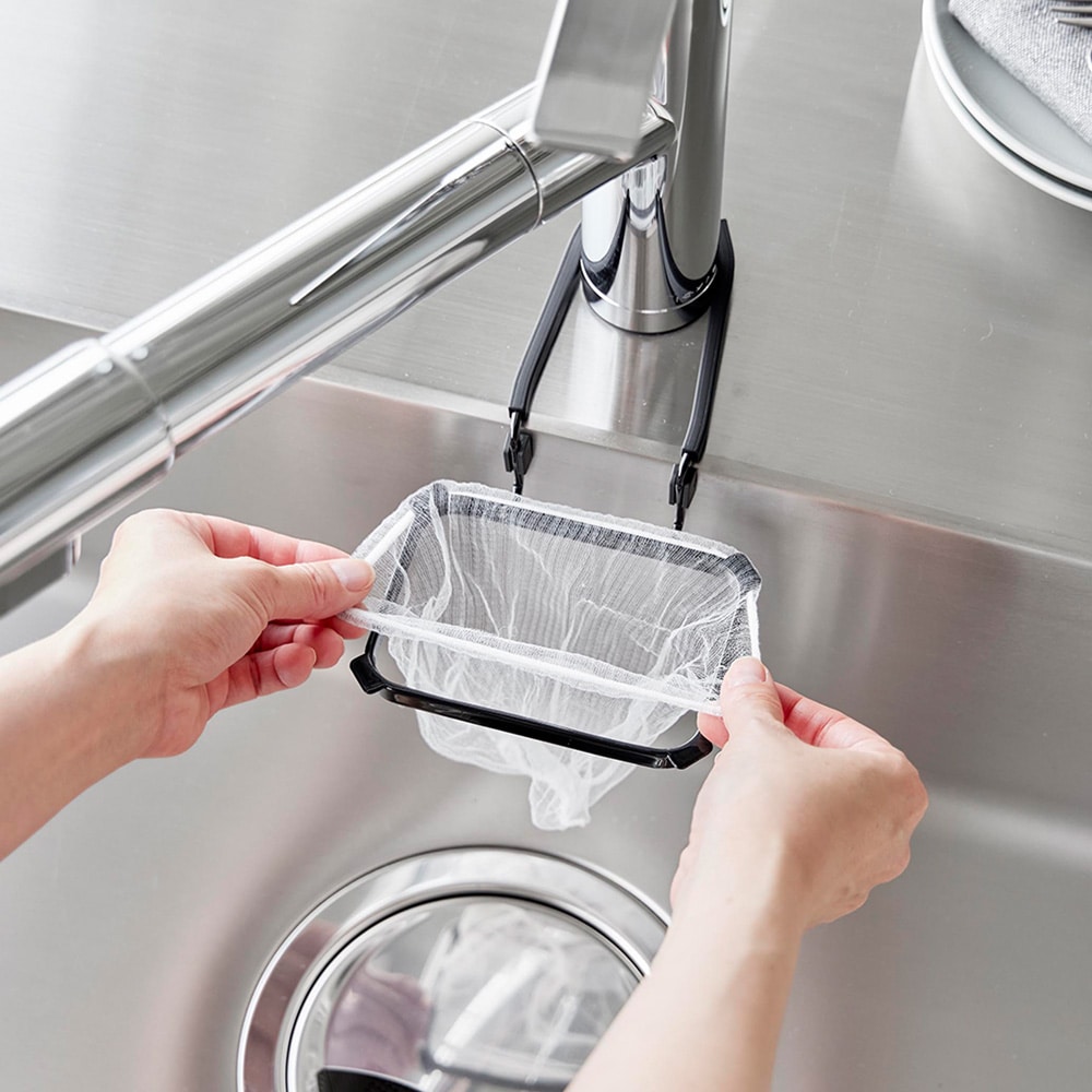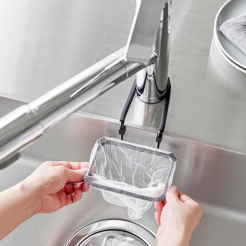 • 蛇口に挟むだけ。シンクを汚さない水切りネットホルダー