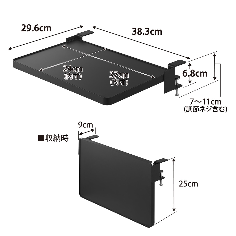 ●使用時:幅約38.3、奥行約29.6、高さ約6.8cm(調節ネジ含まず)、収納時:幅約38.3、奥行約9、高さ約25cm
