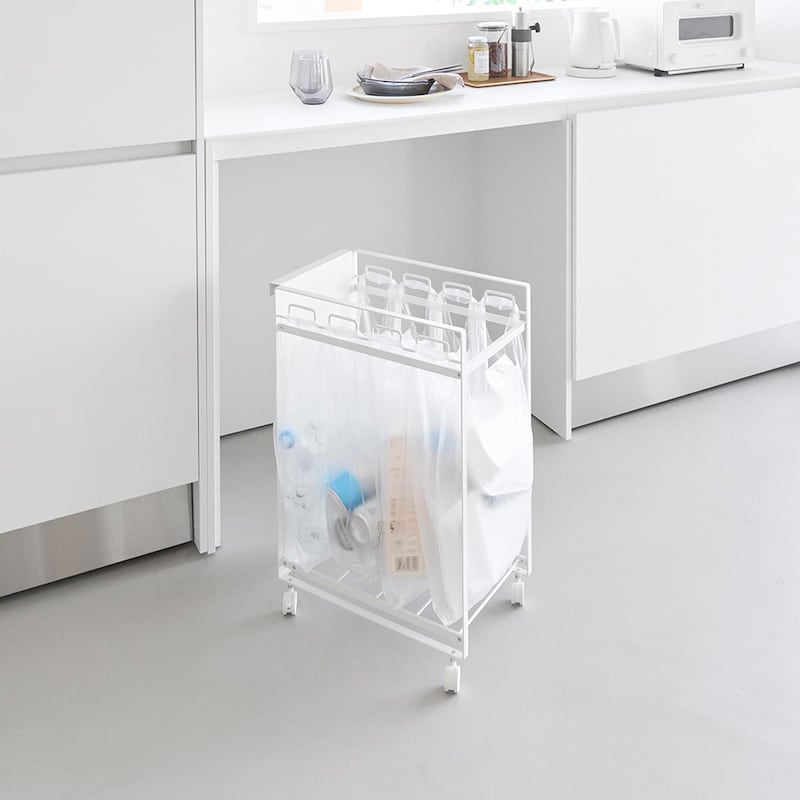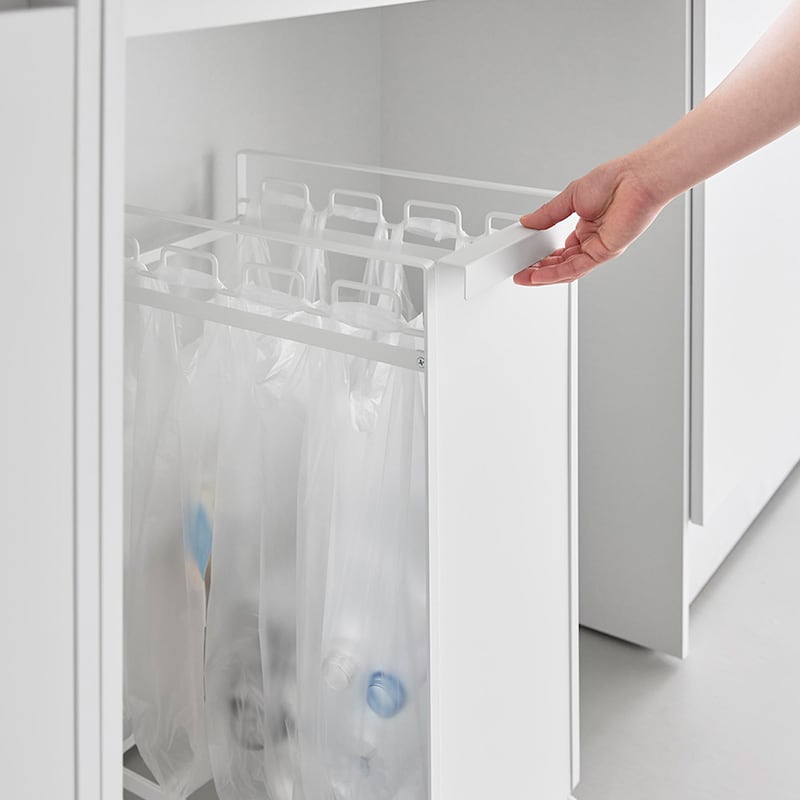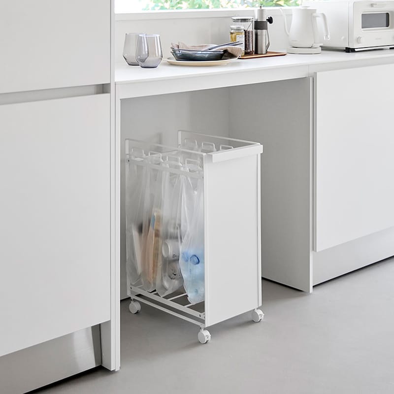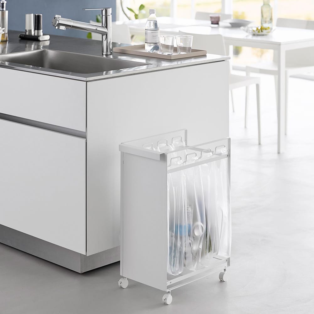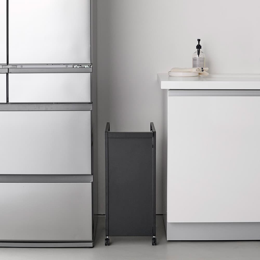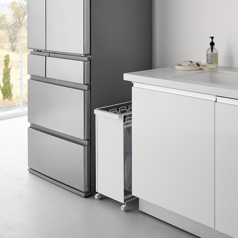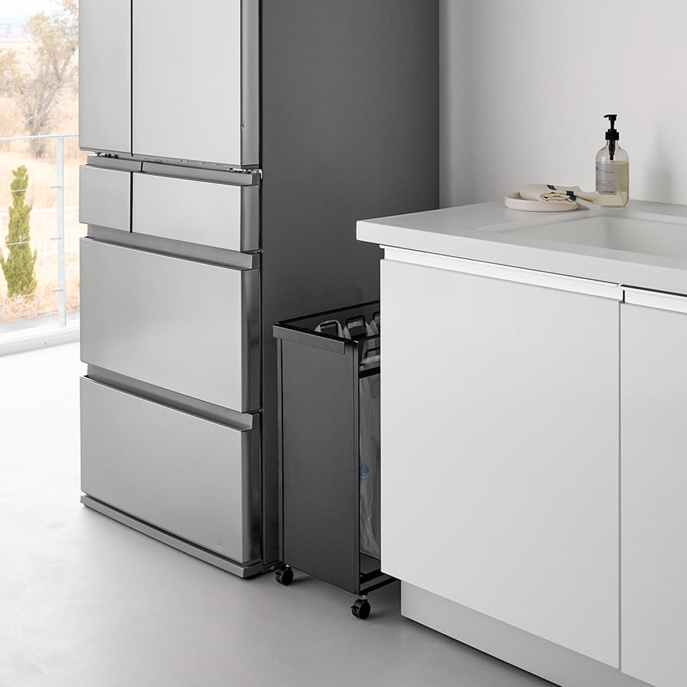 ●冷蔵庫横のデッドスペースにも設置できます。お手持ちのレジ袋や取っ手付きゴミ袋を掛けるだけで、簡単に分別可能。