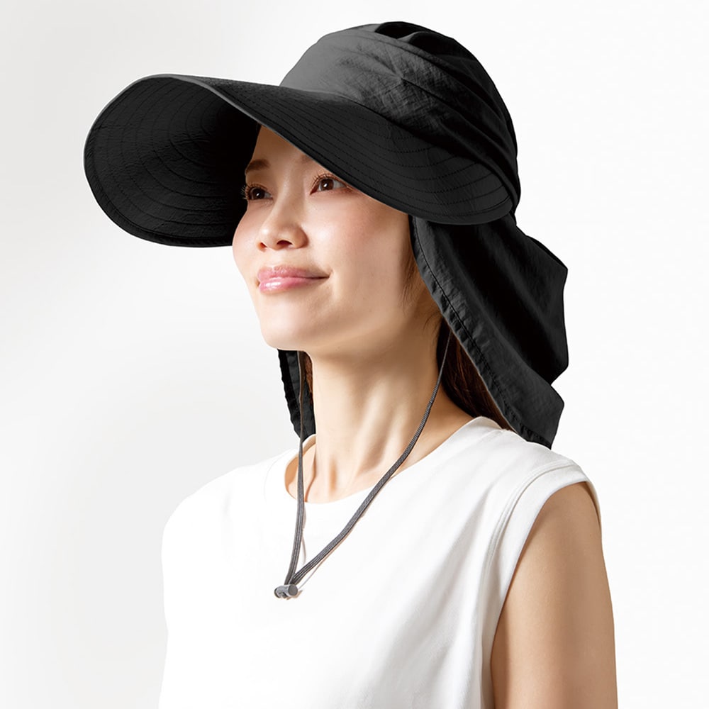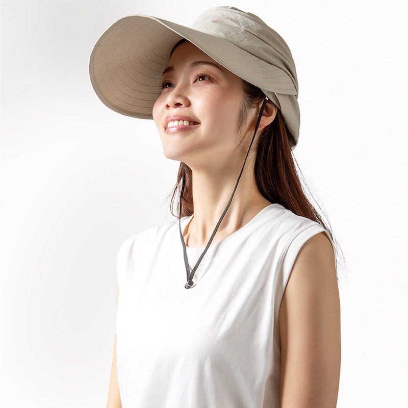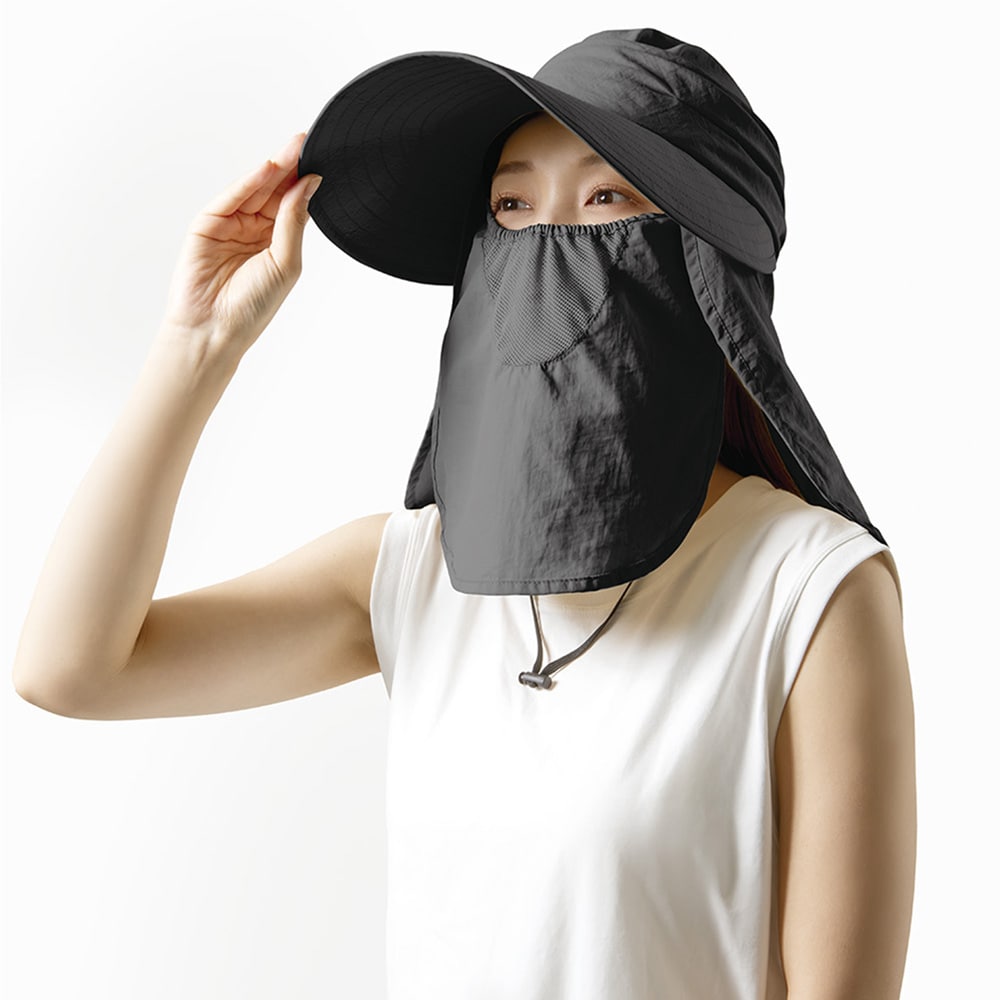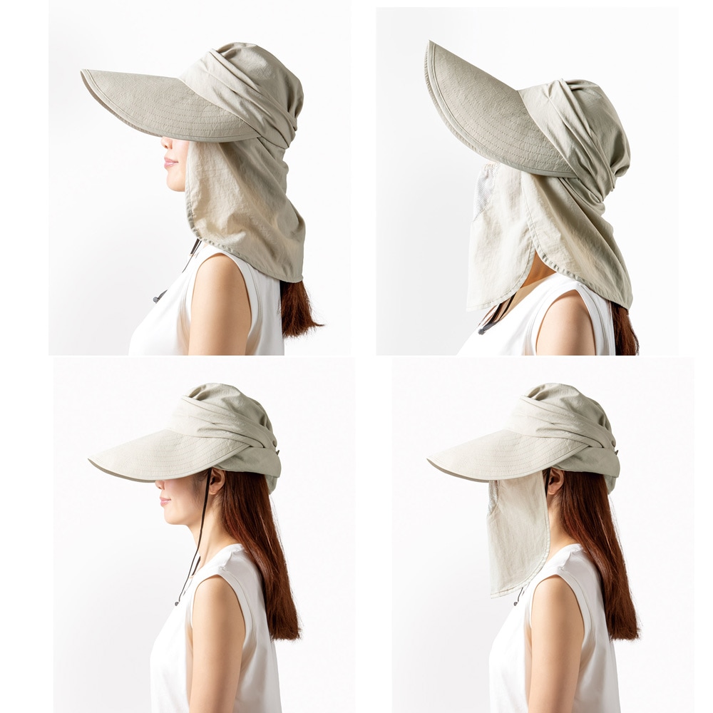 4通りのスタイルに変えられるので、まぶしい日差しや照り返しから顔・首まわりをガード。取り外さずにスタイルをチェンジできます。口元のフェイスカバーはメッシュ素材で通気性もよく呼吸もラクです。たたんでコンパクトになります。UVカットブラック99%、グレージュ97%、近赤外線ブラック70%、グレージュ55%、UPF50+、接触冷感、水陸両用