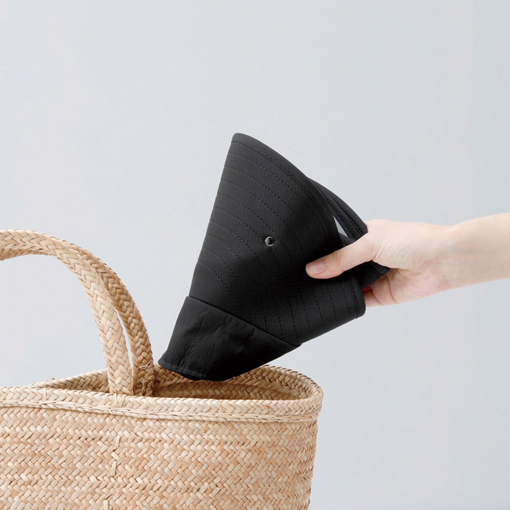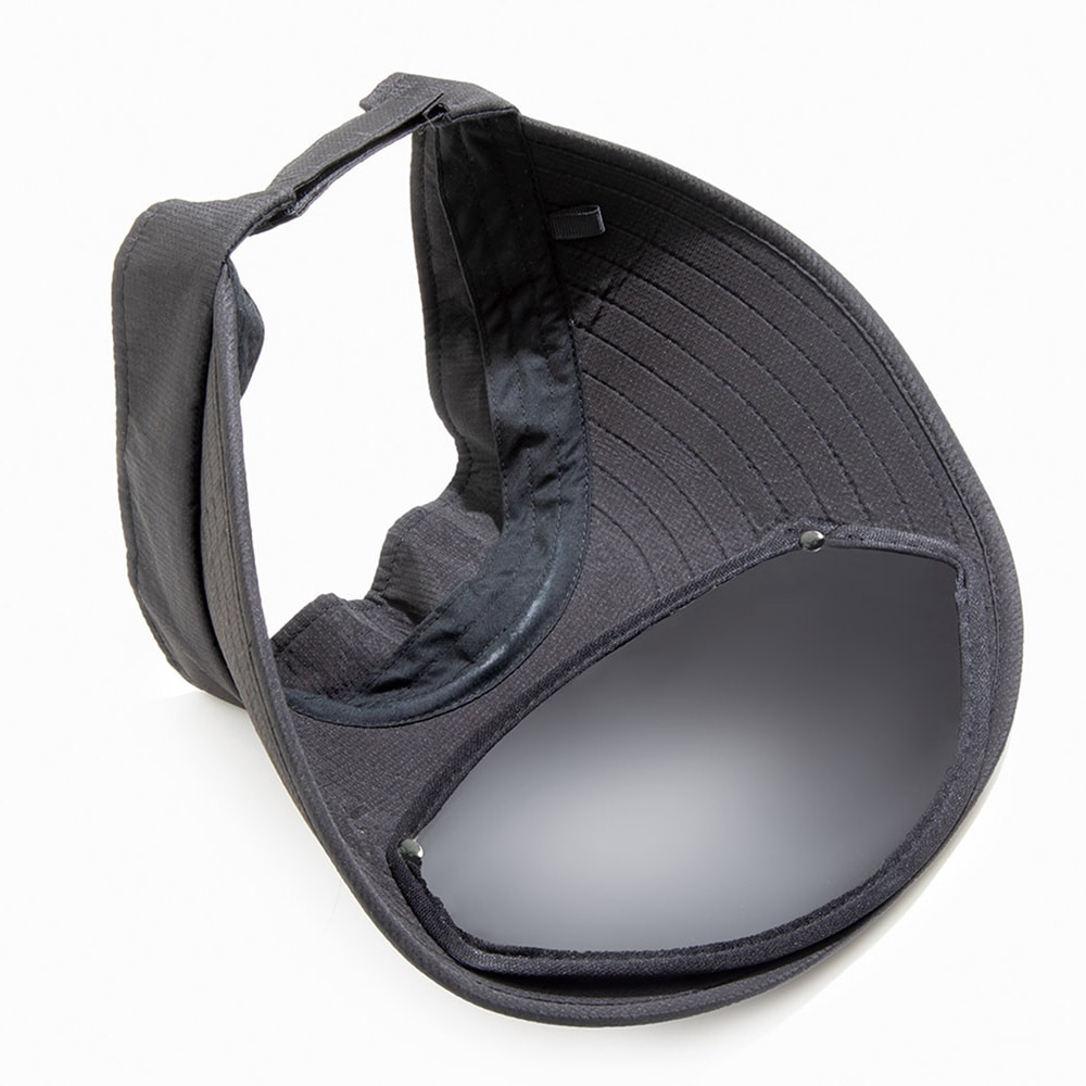 グラスはツバの裏側にすっきりと収納できます。後頭部の面ファスナーでしっかり固定。丸めてコンパクトに収納できます。内側には帽子紐がつけられるループ付。UVカット99%、グラス部98%、近赤外線97%、グラス部52%、UPF50+