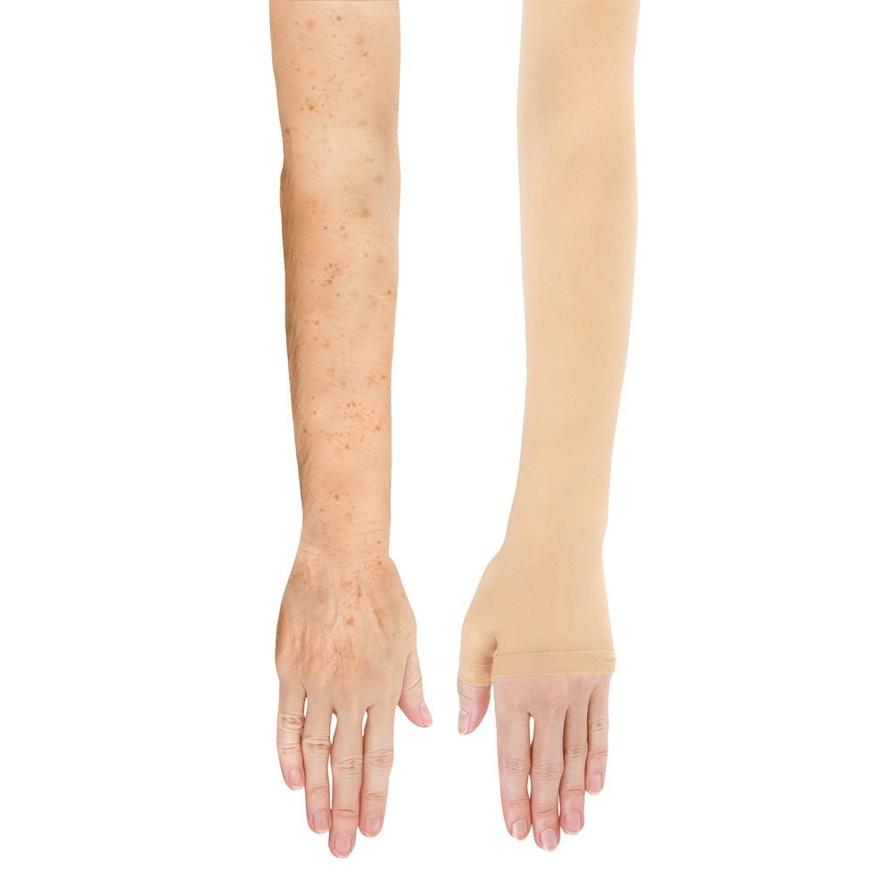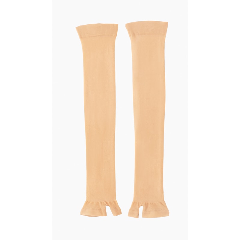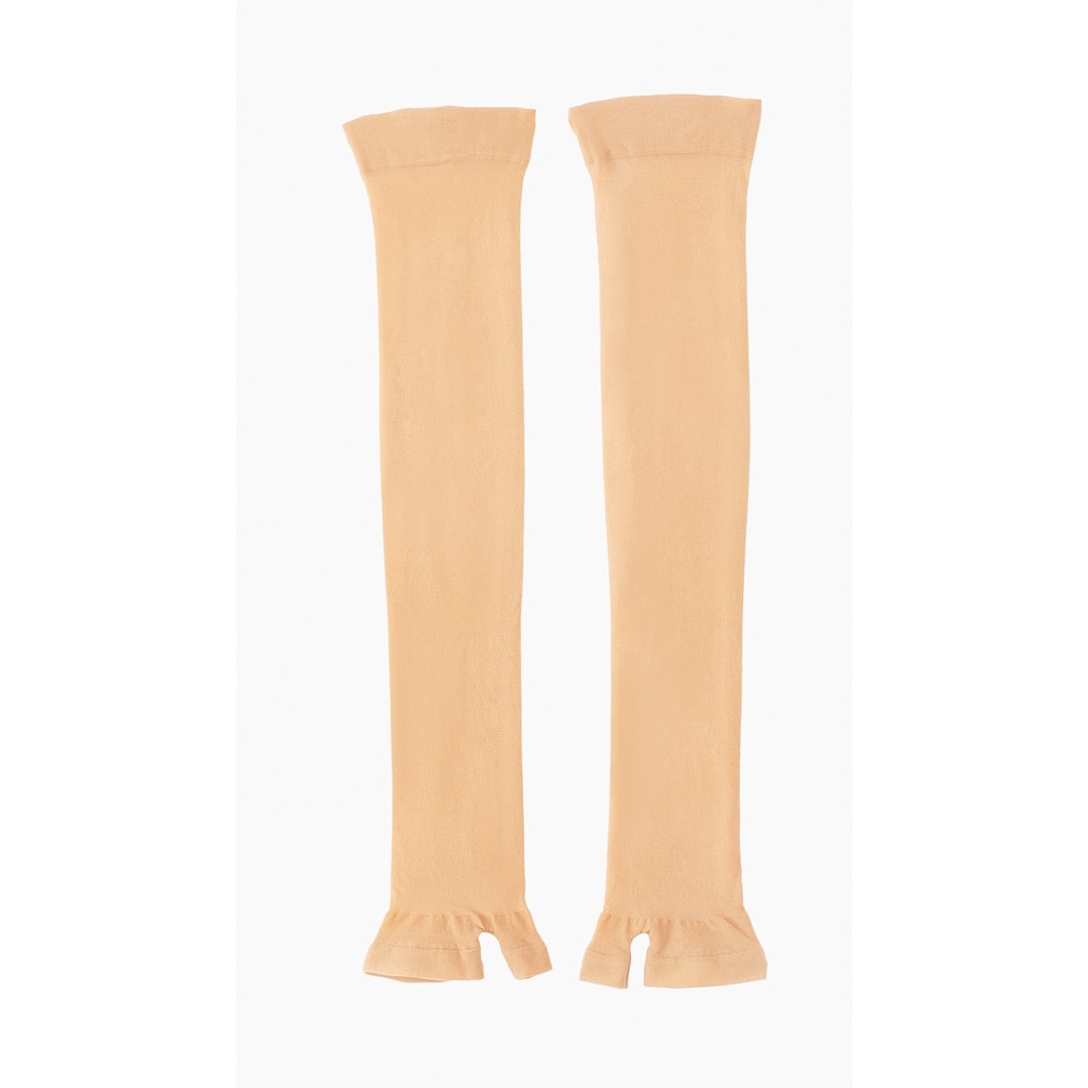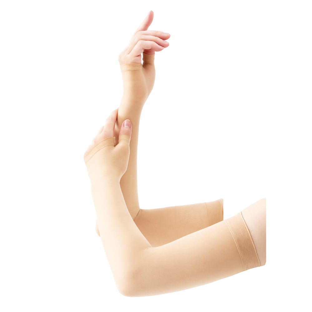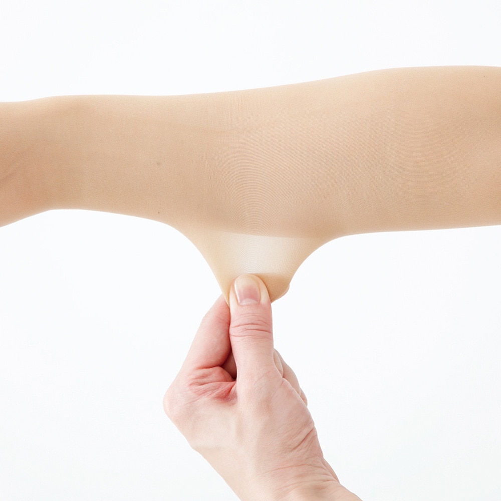 腕の気になるお悩みをカバーしてくれる極薄アームカバー。サッとつけるだけでワントーン明るい自然な素肌感。ストッキングのように肌にピッタリフィットしズレ落ちも心配なし。伝線しにくいロイカ使用。薄さ0.2mm、着圧効果。UV加工