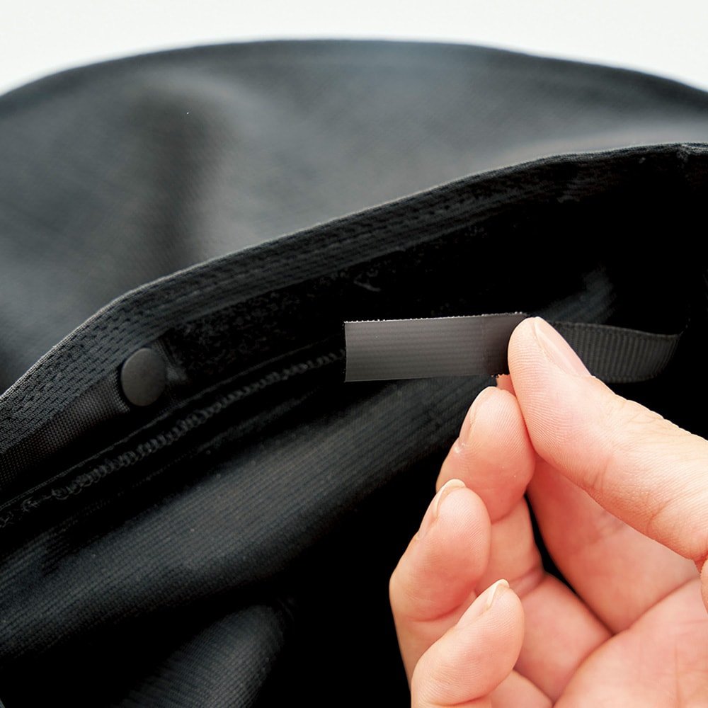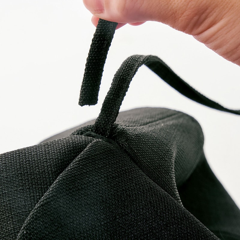 ●リボンコードはあごひもとしても使える2WAY仕様。穴から内側へ通して、あごひもスタイルに