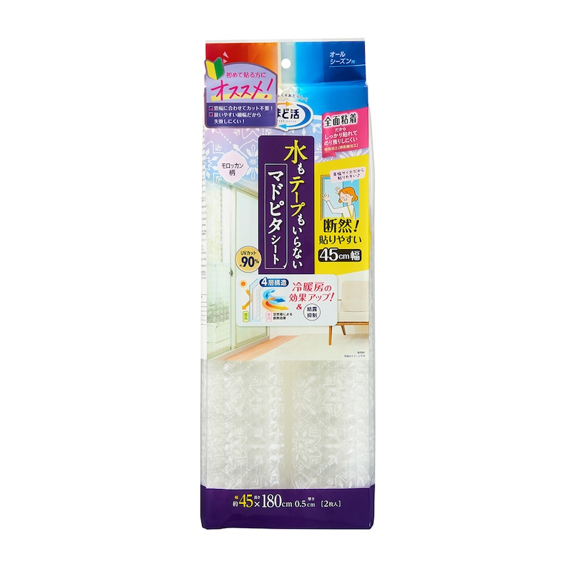■サイズ/約45×180cm●主材/ポリエチレン、アクリル系粘着剤、ポリエステル●UVカット率/約90%●片面粘着加工付き●再剥離可能●ベトナム製