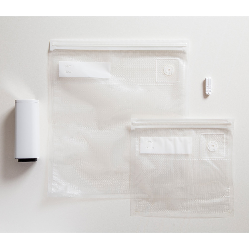 ■サイズ/吸引機:縦約4.9㎝×横約4.9㎝×高さ約12.5㎝、食品保存袋:大(約34×30cm)、小(約21×22cm)●セット内容/吸引機&袋セット:吸引機本体・1台、袋(大・5枚、小・5枚)、スライダー・4個、袋セット:袋(大・20枚、小・20枚)、スライダー・10個●主材/吸引機:ABS、食品保存袋:ポリエチレン、ポリアミド●耐熱温度/100℃●耐冷温度/-20℃●電源/単三電池4本●中国製