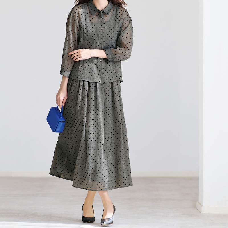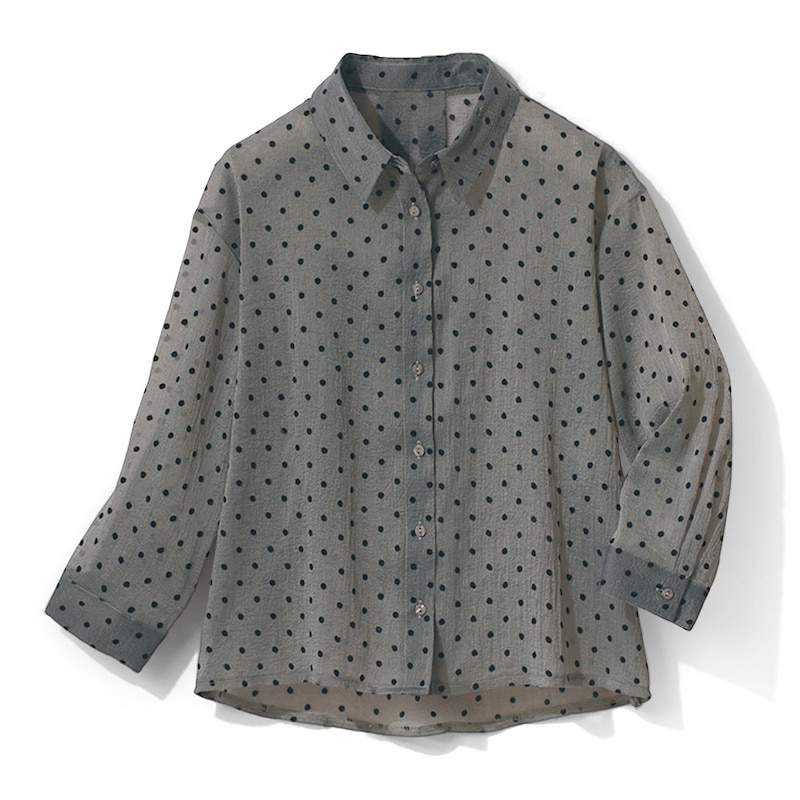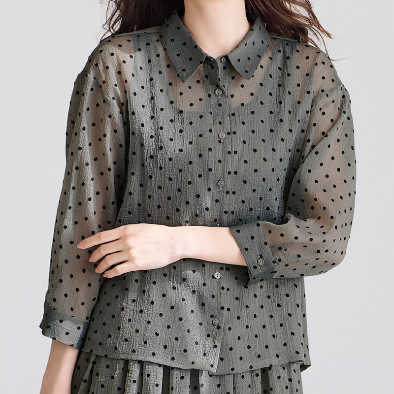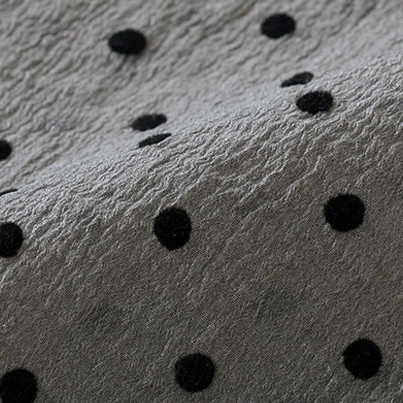 ほのかな透け感とシボ感のある生地にフロッキープリントのドット柄が可愛らしい雰囲気