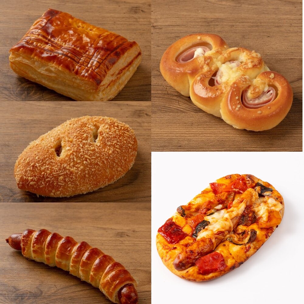 ●宮崎県産霧島黒豚のミートパイ69g×2個、焼きビーフカレーパン86g×3個、粗挽きソーセージパイ88g×2個、ちぎれるハムチーズ95g×3個、彩り野菜とソーセージのフォカッチャ109g×2個