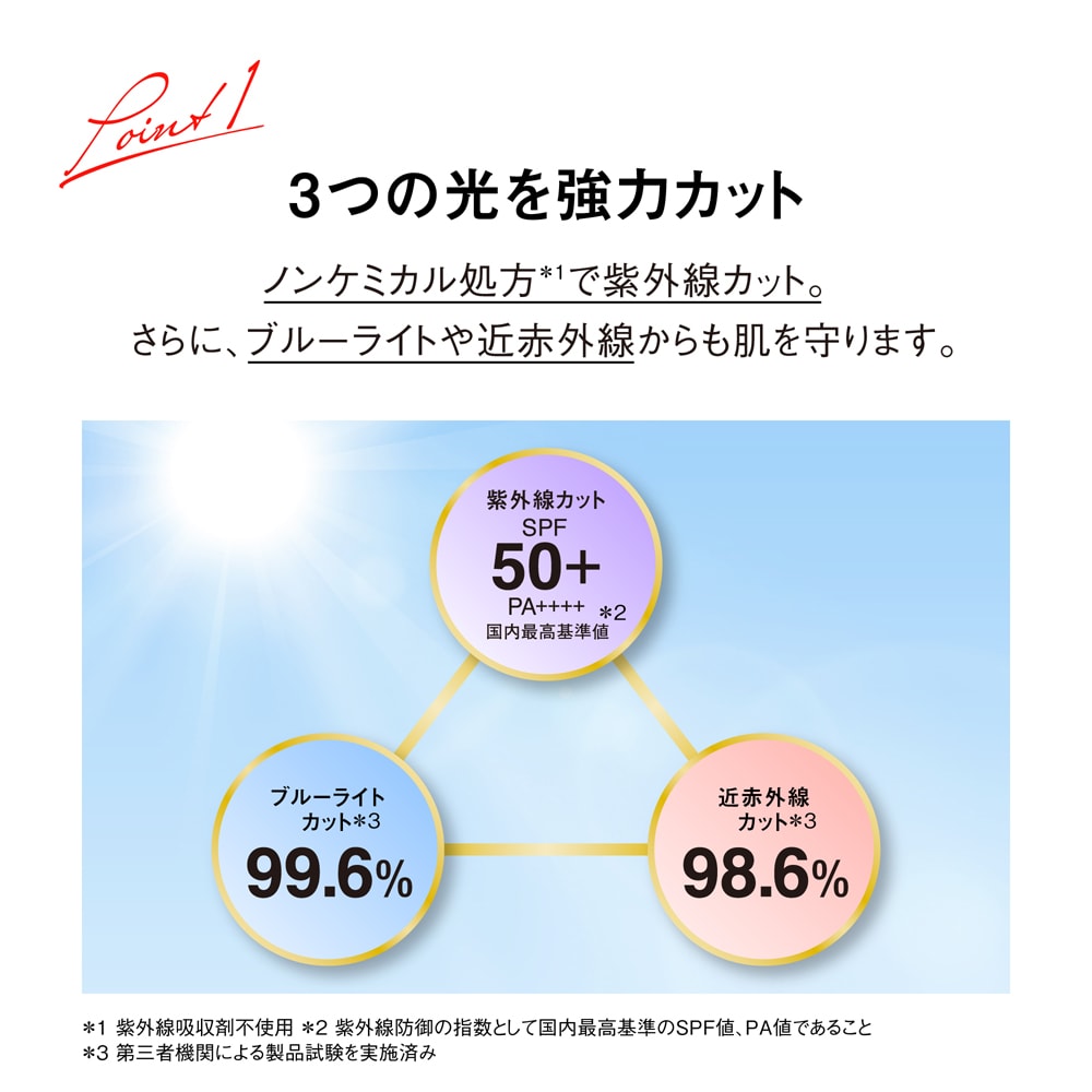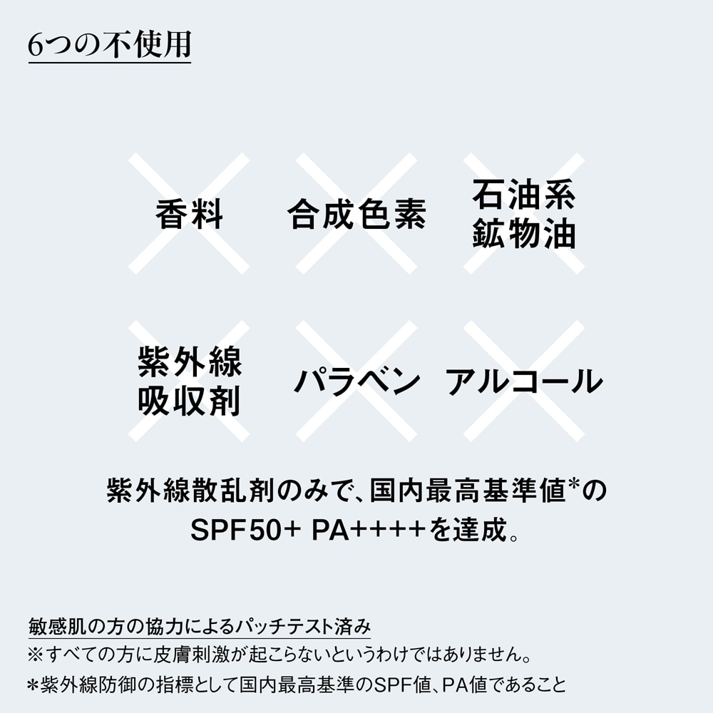 紫外線吸収剤不使用で、紫外線防止効果は国内最高基準値のSPF50+・PA++++。