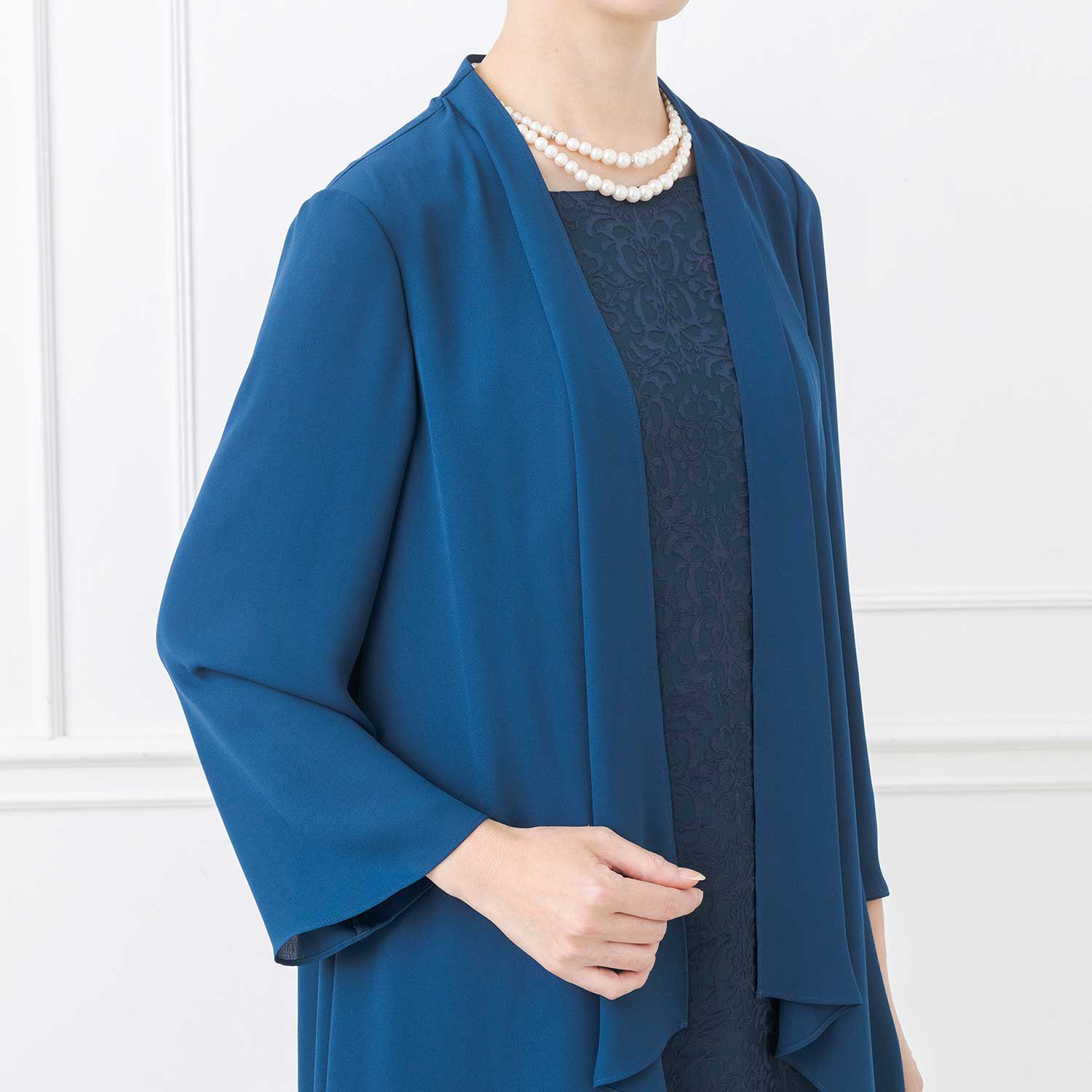 ・前見頃にはオパール素材を使い、スタンドカラーから自然に流れるようなカバーアップのドレープとともに華やかな印象