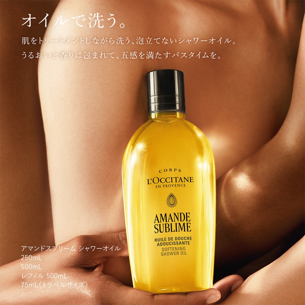 濡れたボディにつけ、手で肌をマッサージしながらオイルを乳化させ洗い流すユニークなシャワーオイル(ボディソープ)。