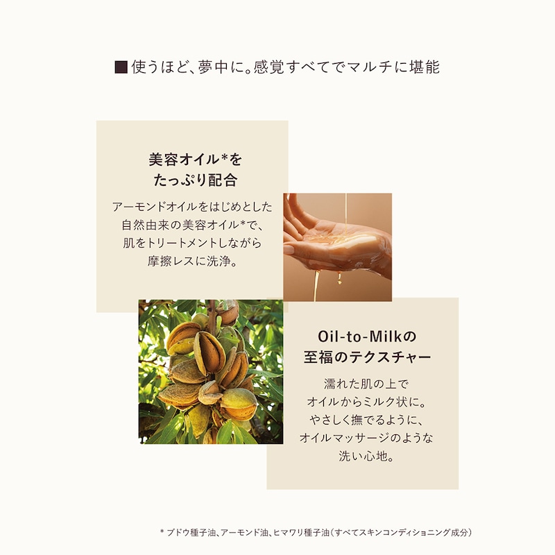 ・アーモンドオイル(*)をはじめとした自然由来の美容オイルで、肌をトリートメントしながら洗浄。