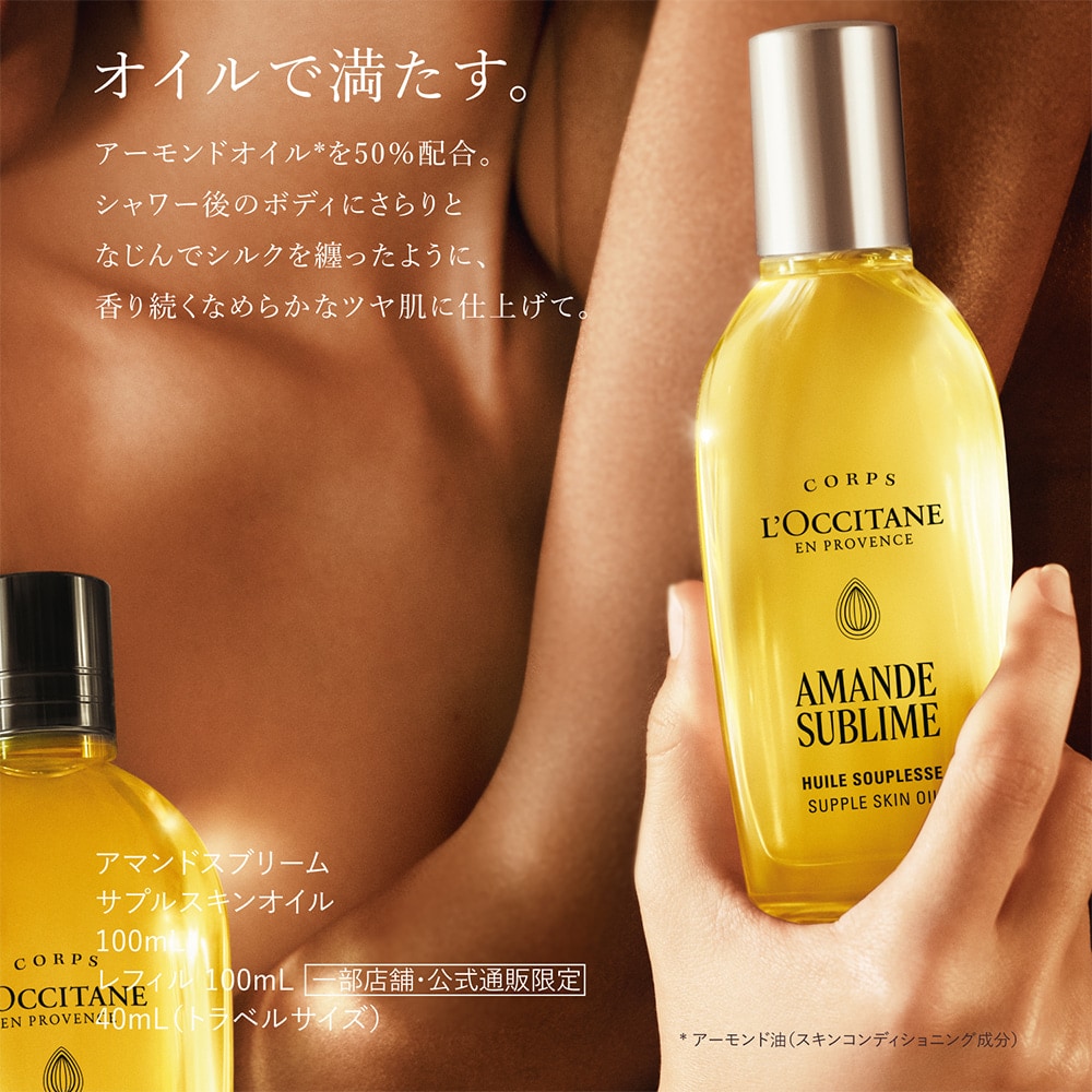 アーモンドオイル(*)50%配合。シャワー後のボディにさらりとなじんで、香り続くなめらかなツヤ肌へ。