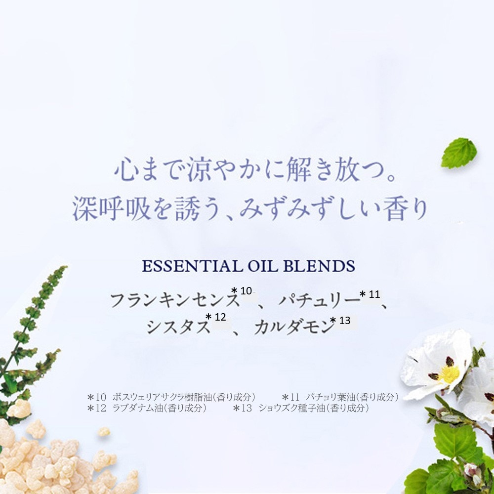 フランキンセンスやパチュリー、カルダモンなどの精油をブレンドした、みずみずしく涼やかな香り。