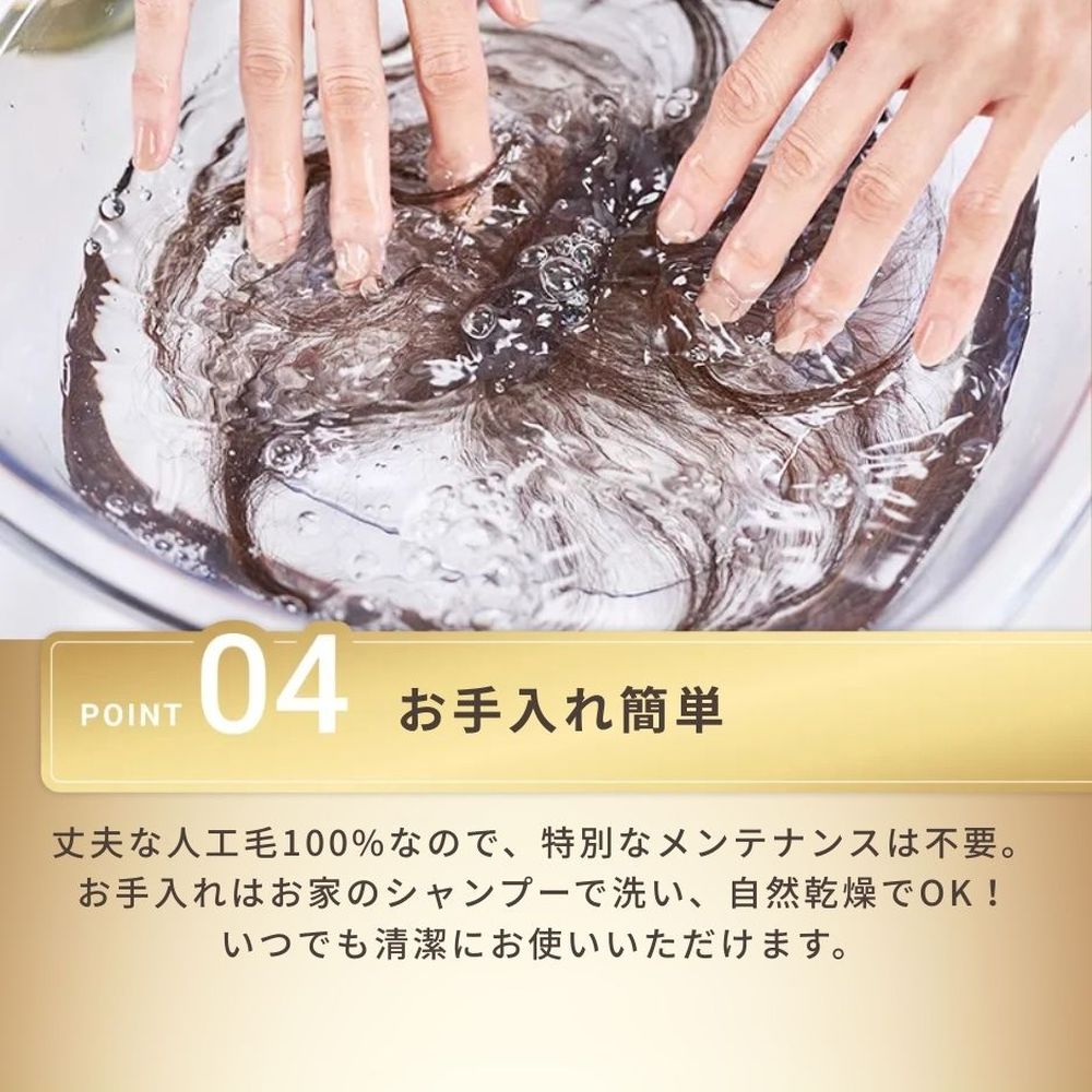 既存の「HAIRMATE chacha」と同じ丈夫な人工毛100%なので、お手入れはお手持ちのシャンプーで洗い、自然乾燥すればOKです。