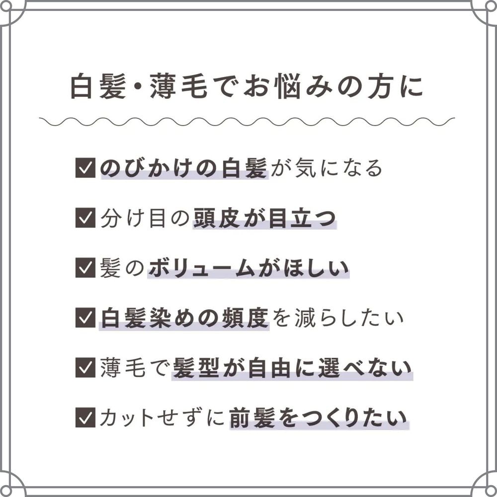地肌や白髪をカバーして、頭頂部のボリュームアップもラクラク叶えるビューティーアイテムです。