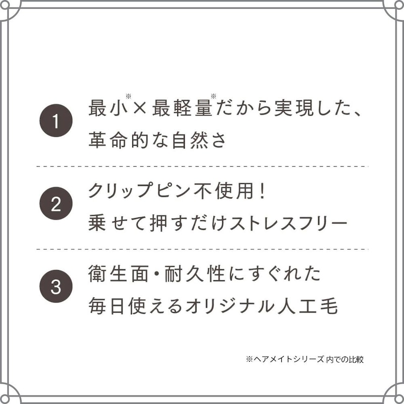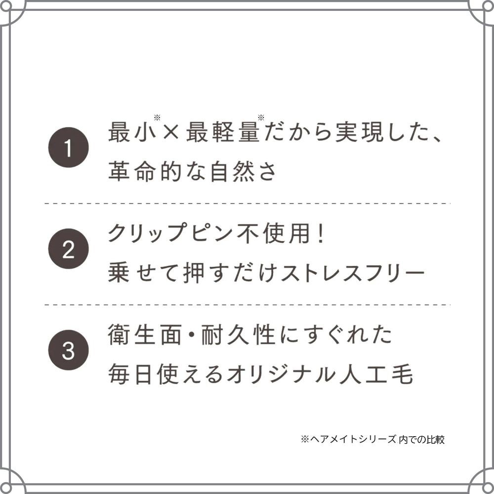 ●クリップピン不使用(独自開発のチャチャテープ使用)、 形状記憶毛