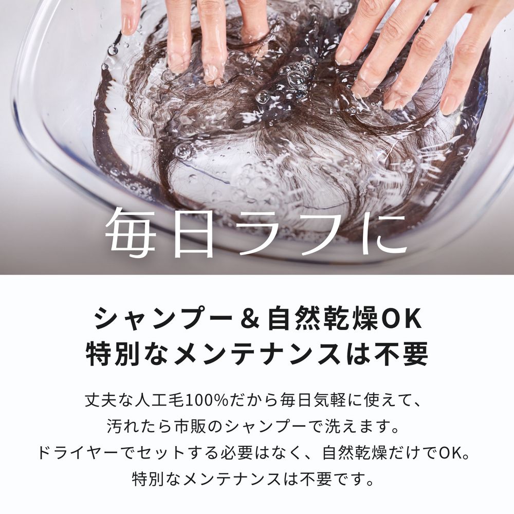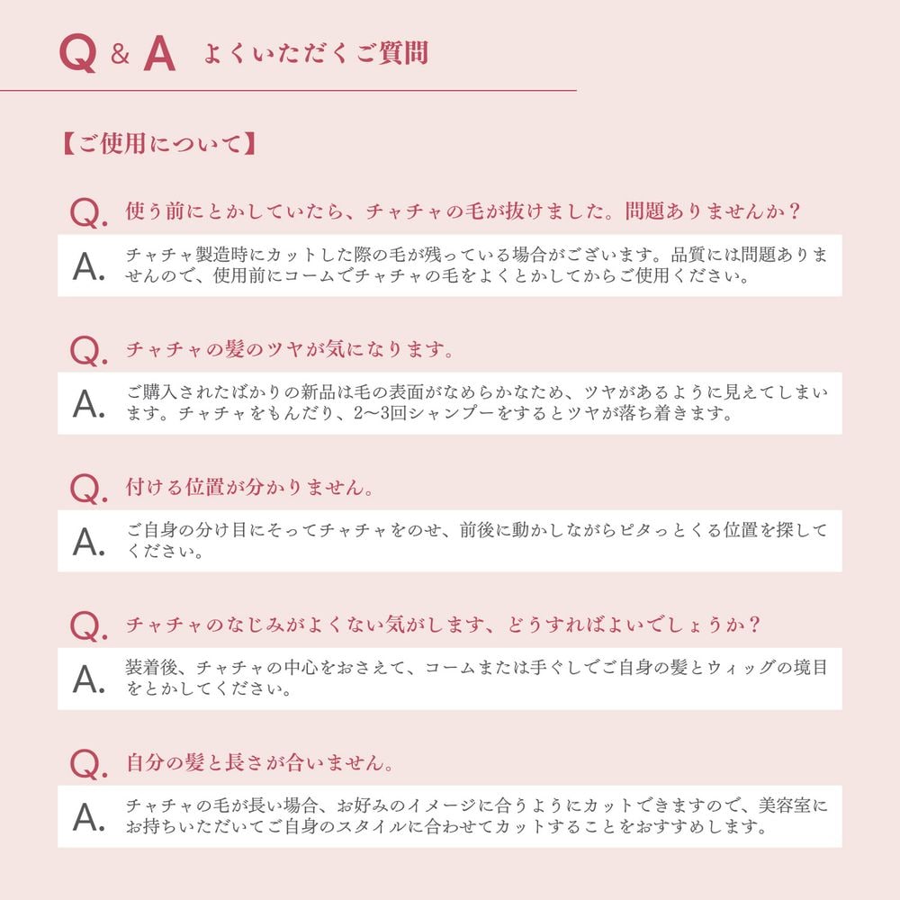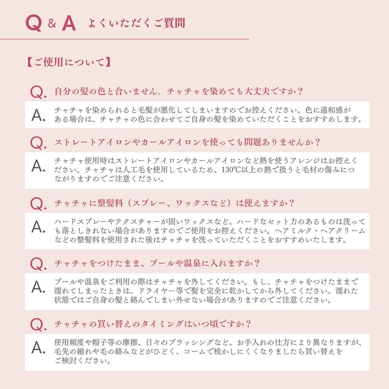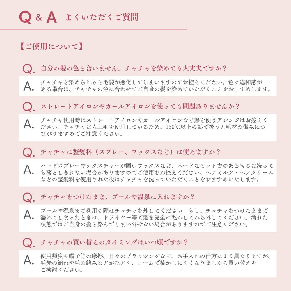 ※チャチャ使用時に、ストレートアイロン、カールアイロンなど熱を使うヘアアレンジはお控えください。人工毛を使用しているため、130℃以上の熱で扱うと毛材の傷みにつながりますのでご注意ください。