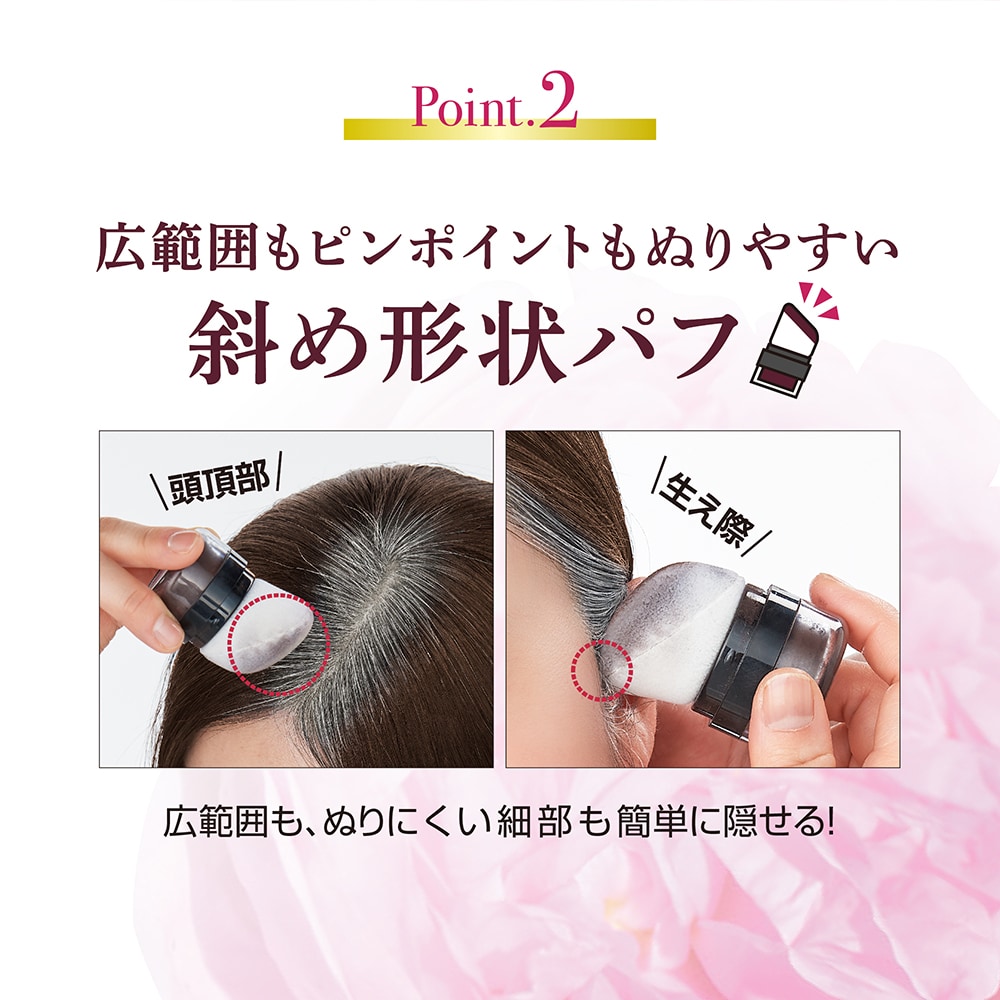 気になる部分にポンポンと乗せるだけで、気になる地肌や生え際の白髪を隠すヘアファンデーションです。