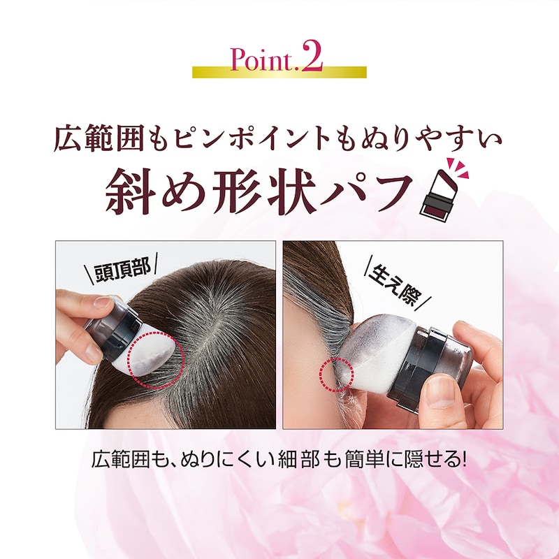 斜め形状のパフで軽くたたき込むだけなので、テクニックいらずで生え際まで簡単。