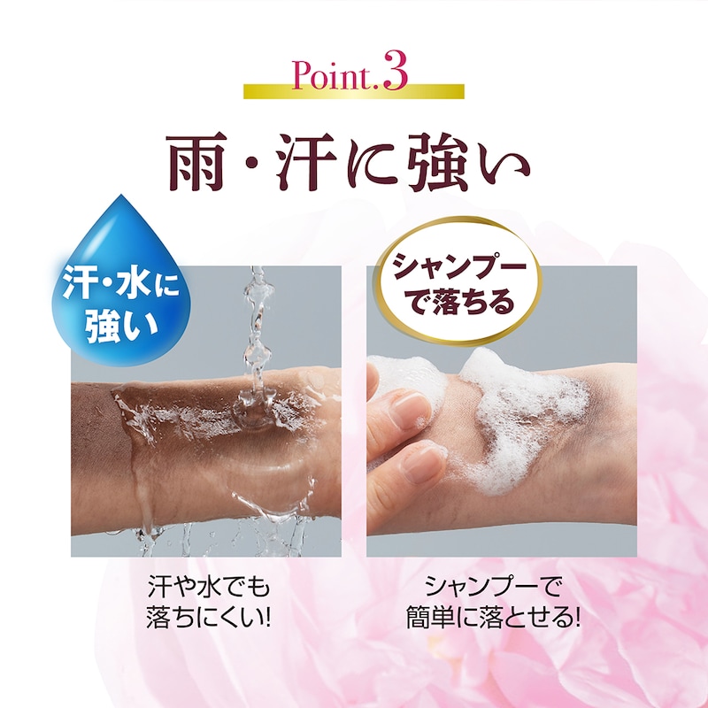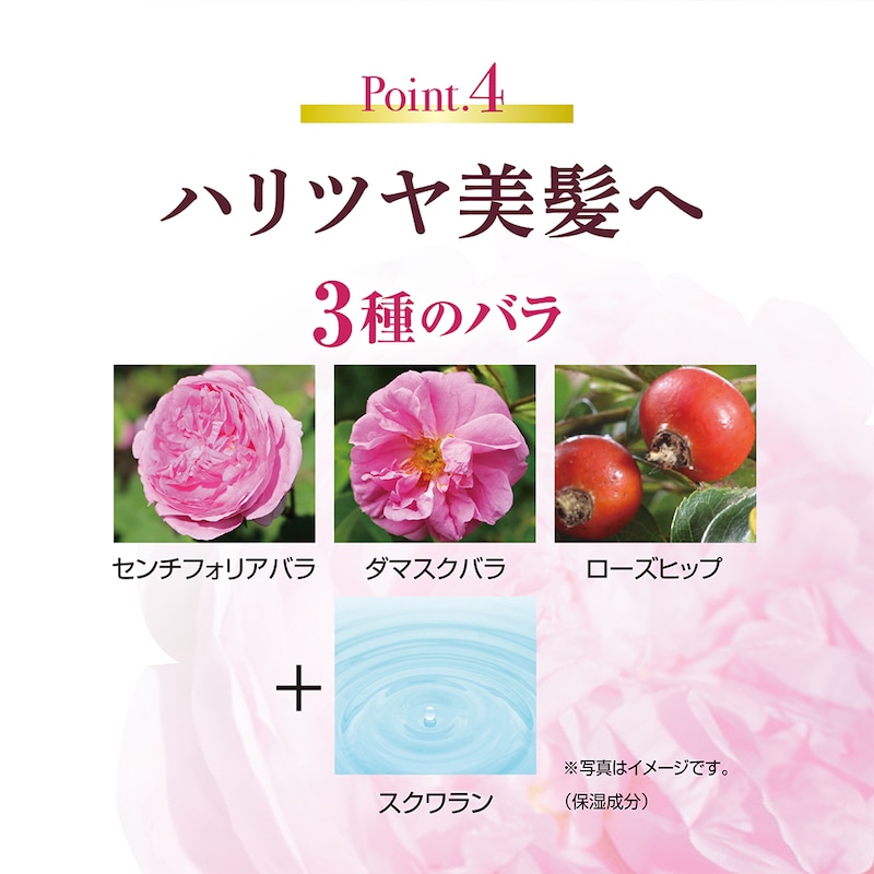 植物性スクワラン(保湿成分)で抽出した3種のバラ由来エキス配合で、髪と地肌を乾燥から保護する効果も。