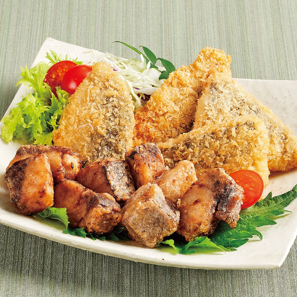 新鮮な長崎県産の真アジと天然ブリを使用。肉厚のアジフライと、旨み豊かなブリの竜田揚げの2種セットです。