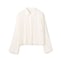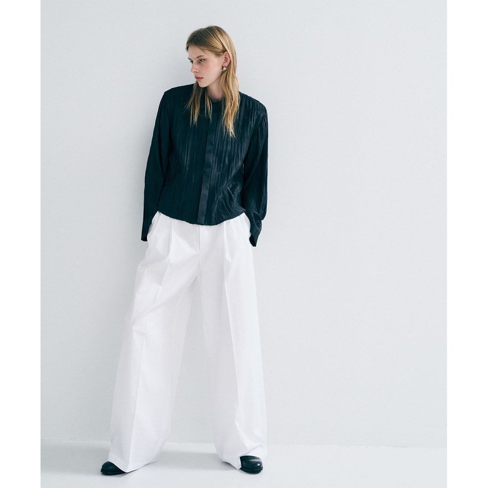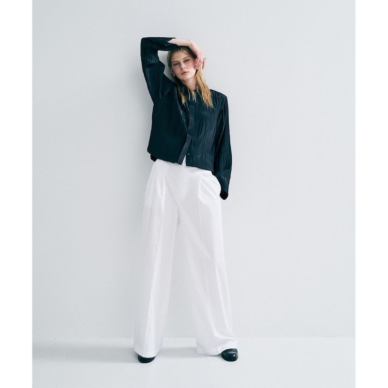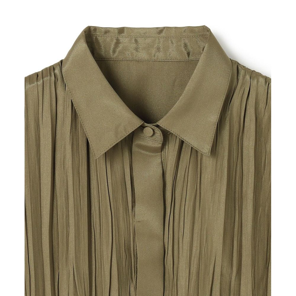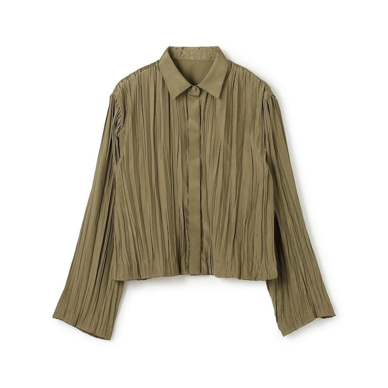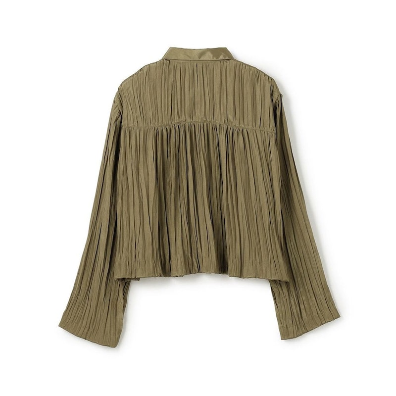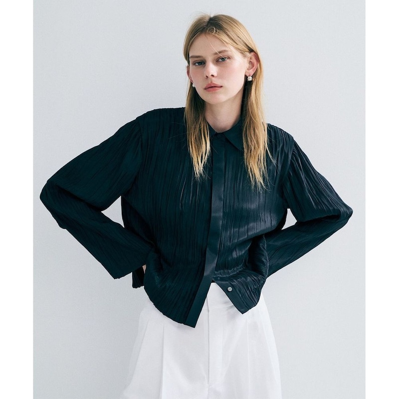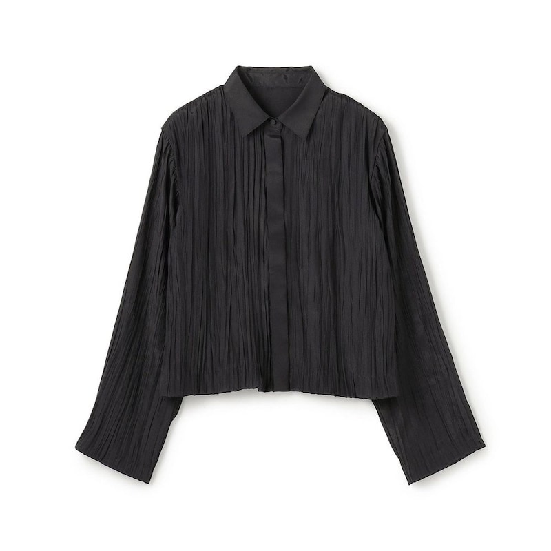 衿・前立てにはプリーツ無しのフラットな素材を使用し、素材のコントラストを感じるショート丈シャツに。