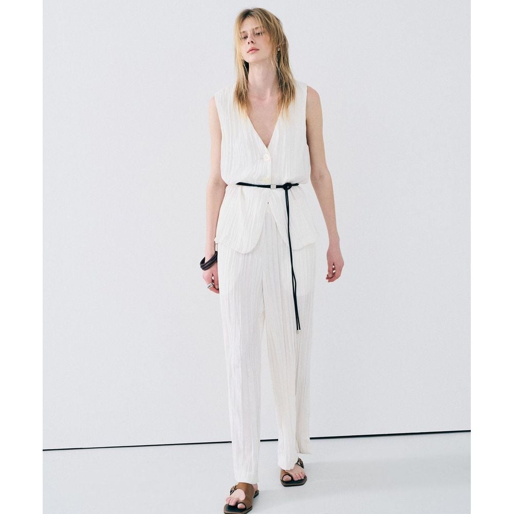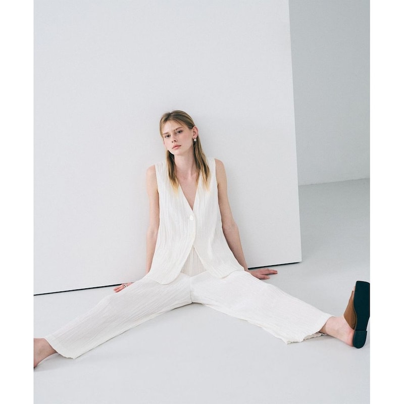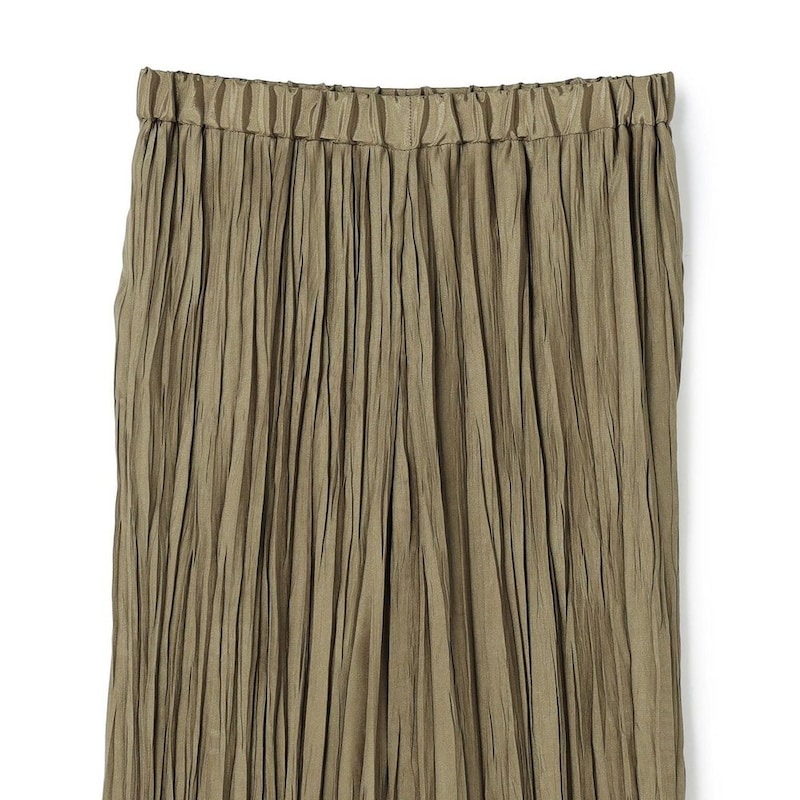 プリーツの施された素材は裁断や縫製が難しく、敬遠されがちな中uncraveではデザインとして取り入れました。存在感のある素材の為、ウエストはゴム仕様で軽やかなイージーパンツに。