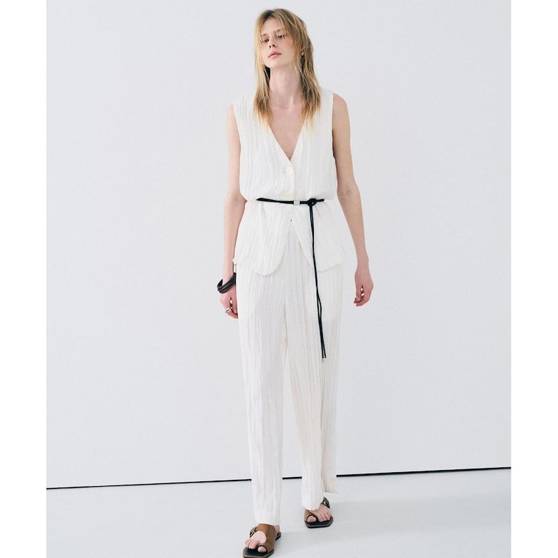 同素材のジレブラウスやシャツとのセットアップがおすすめです。