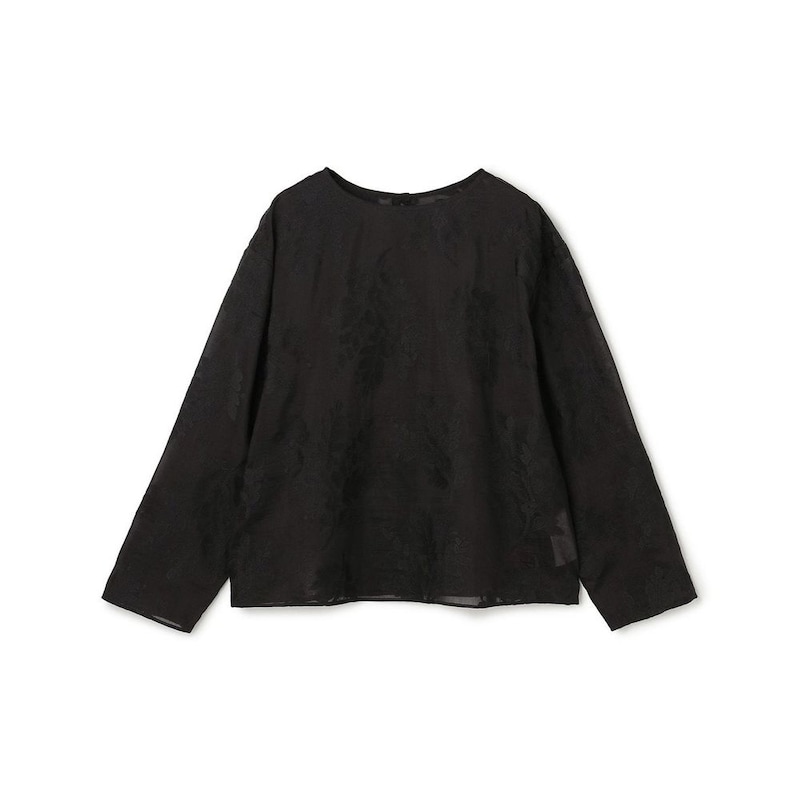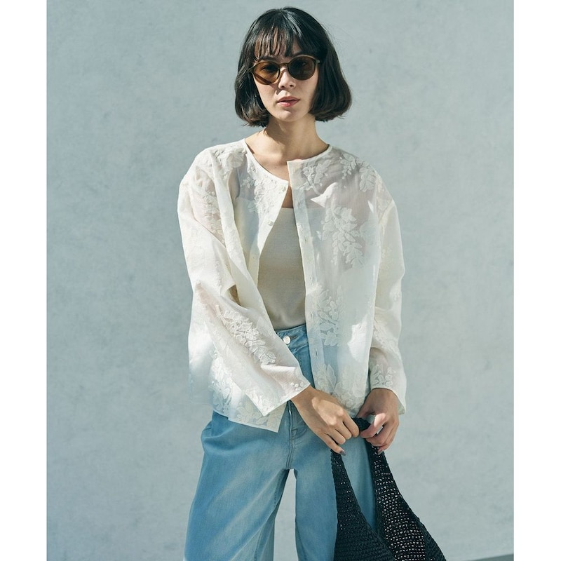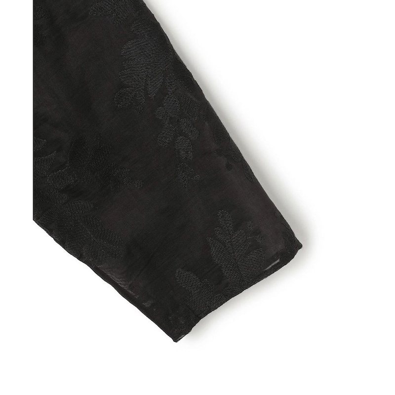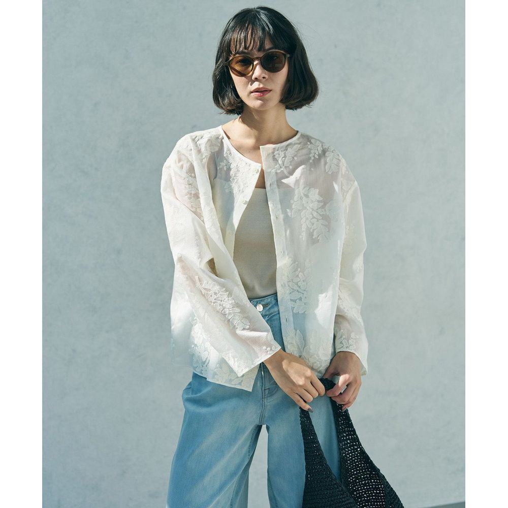 オリジナル柄の刺繍をあしらったシアー素材を使用し、軽やかな雰囲気に仕上げた一枚。