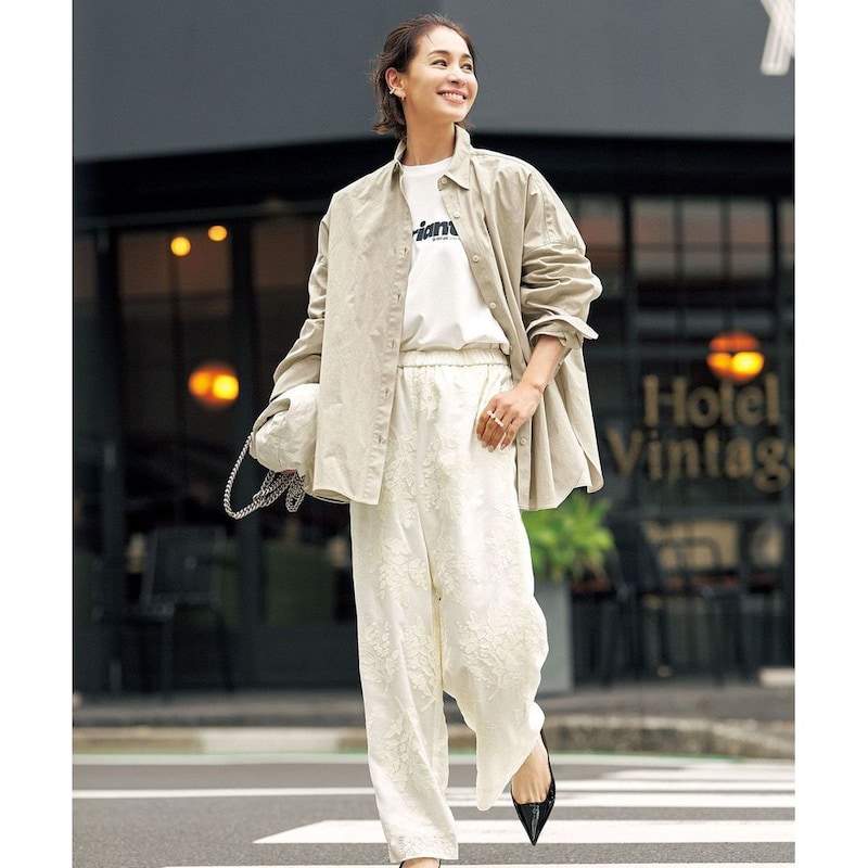 Tシャツやシャツなどのカジュアルアイテムはもちろん、同素材のトップスと合わせるとセットアップ風のコーディネートも楽しめます。