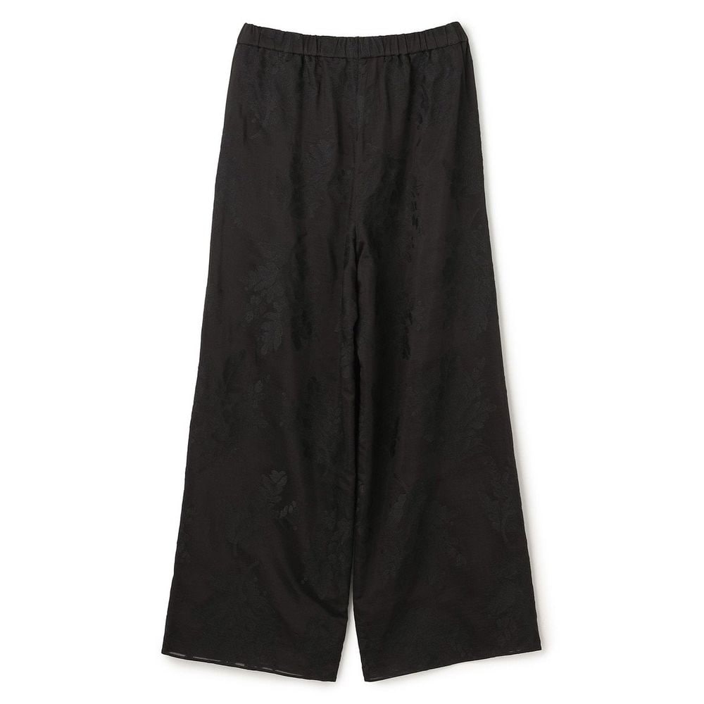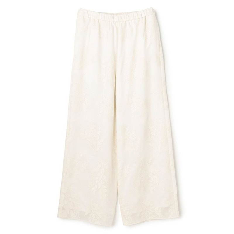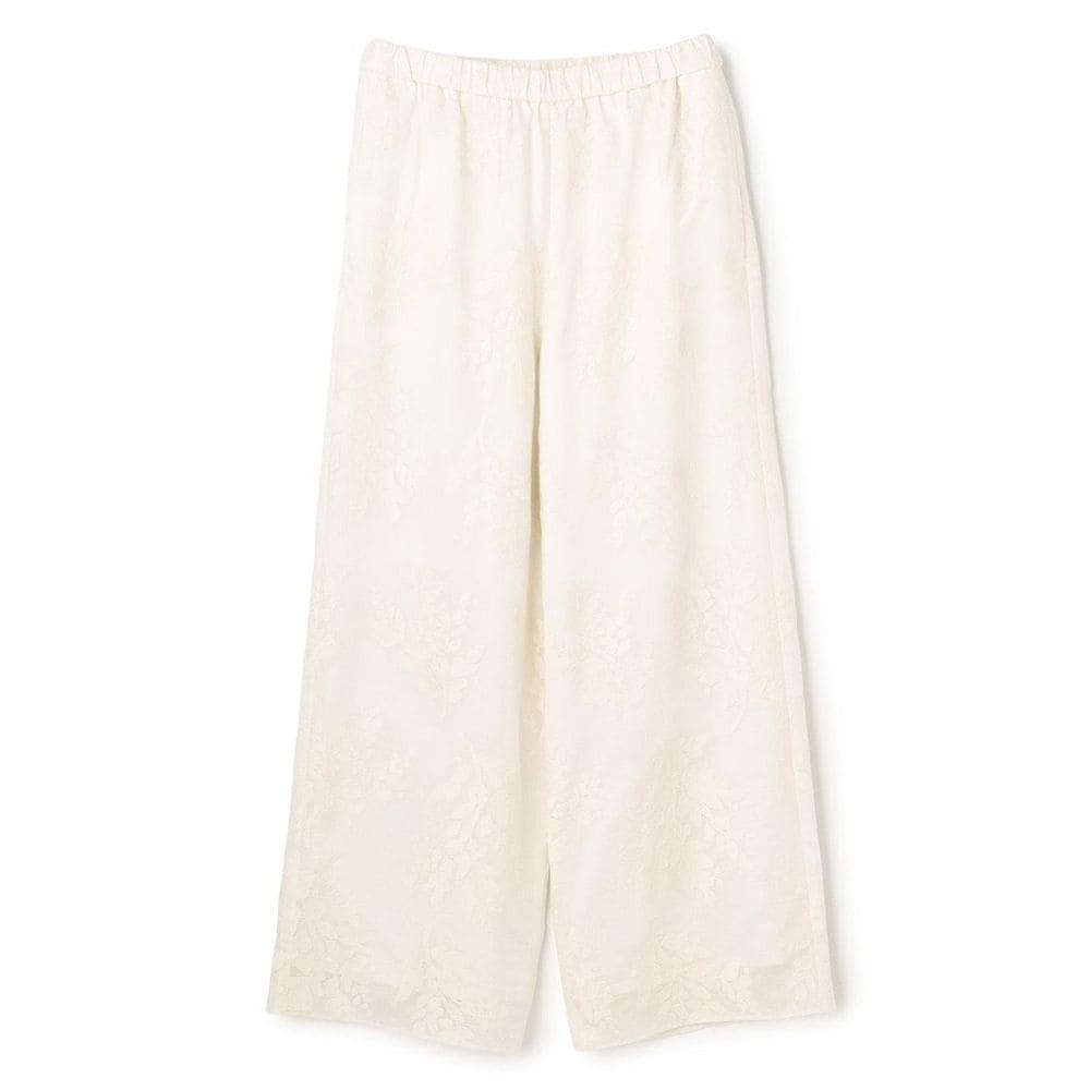 シアー素材にオリジナル柄の刺繍を施した、存在感あふれるワイドパンツ。