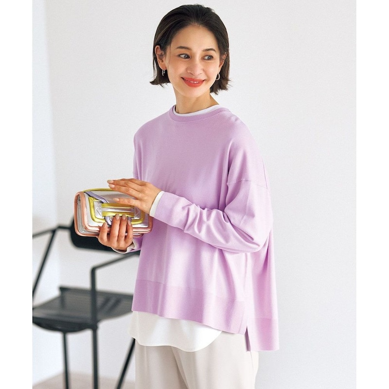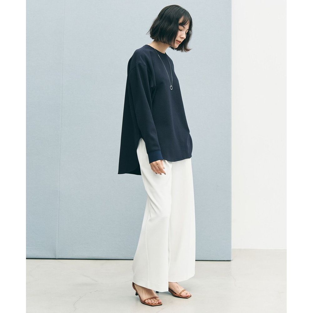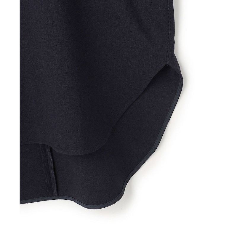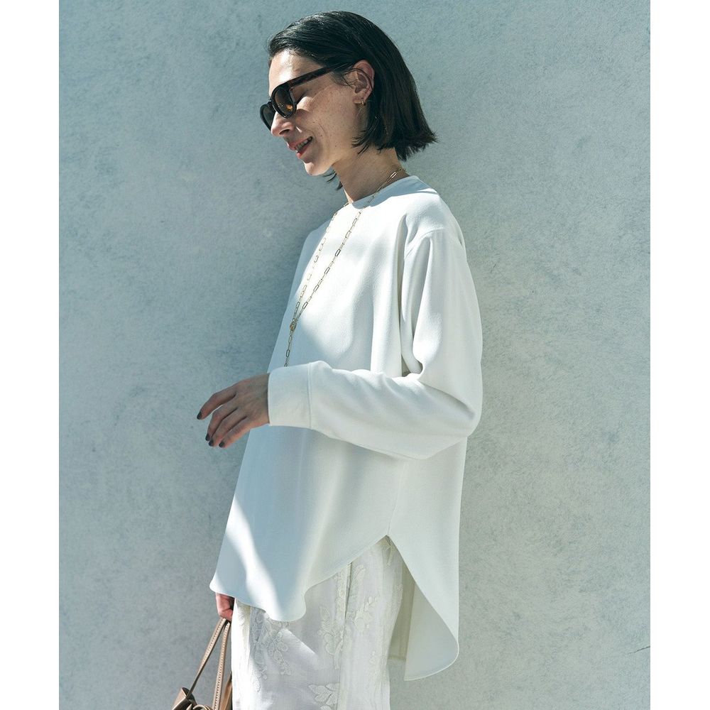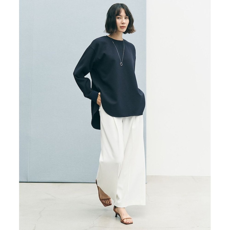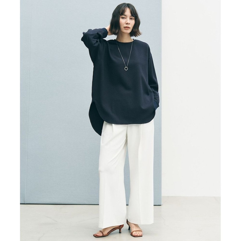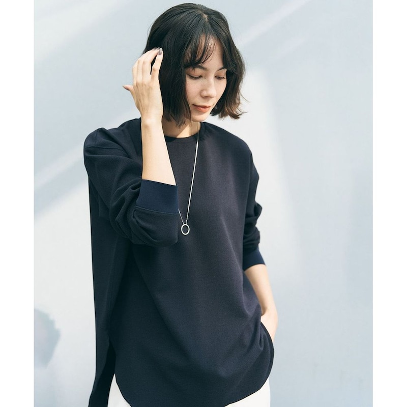 上品な前後差のあるシャツテールが、袖口のニットリブや表振りステッチといったディテールと組み合わさることで、洗練されたこなれ感を演出します。