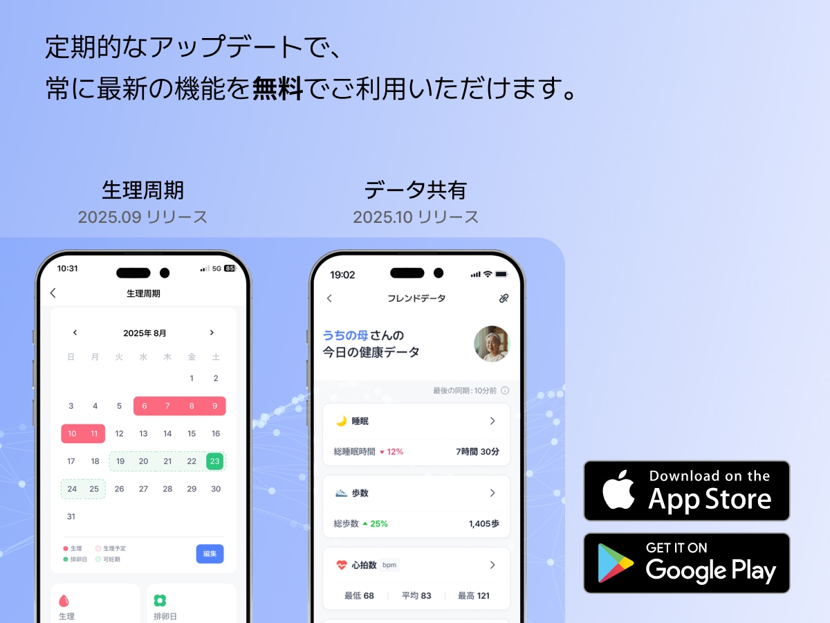計測したデータを専用アプリで手軽にチェックして健康管理。iPhone・Androidの両方に対応。2025年6月から新たにAppleヘルスケア・GoogleFitとの連携も可能になりました。