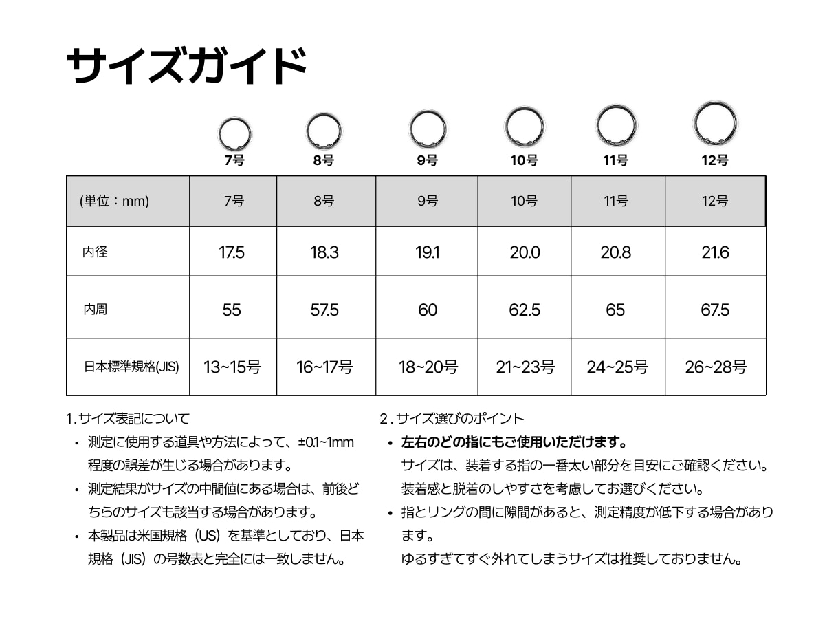 ●適応サイズ/Size7:約13~15号、Size8:約16~17号、Size9:約18~20号、Size10:約21~22号、Size11:約23~25号、Size12:約26~28号