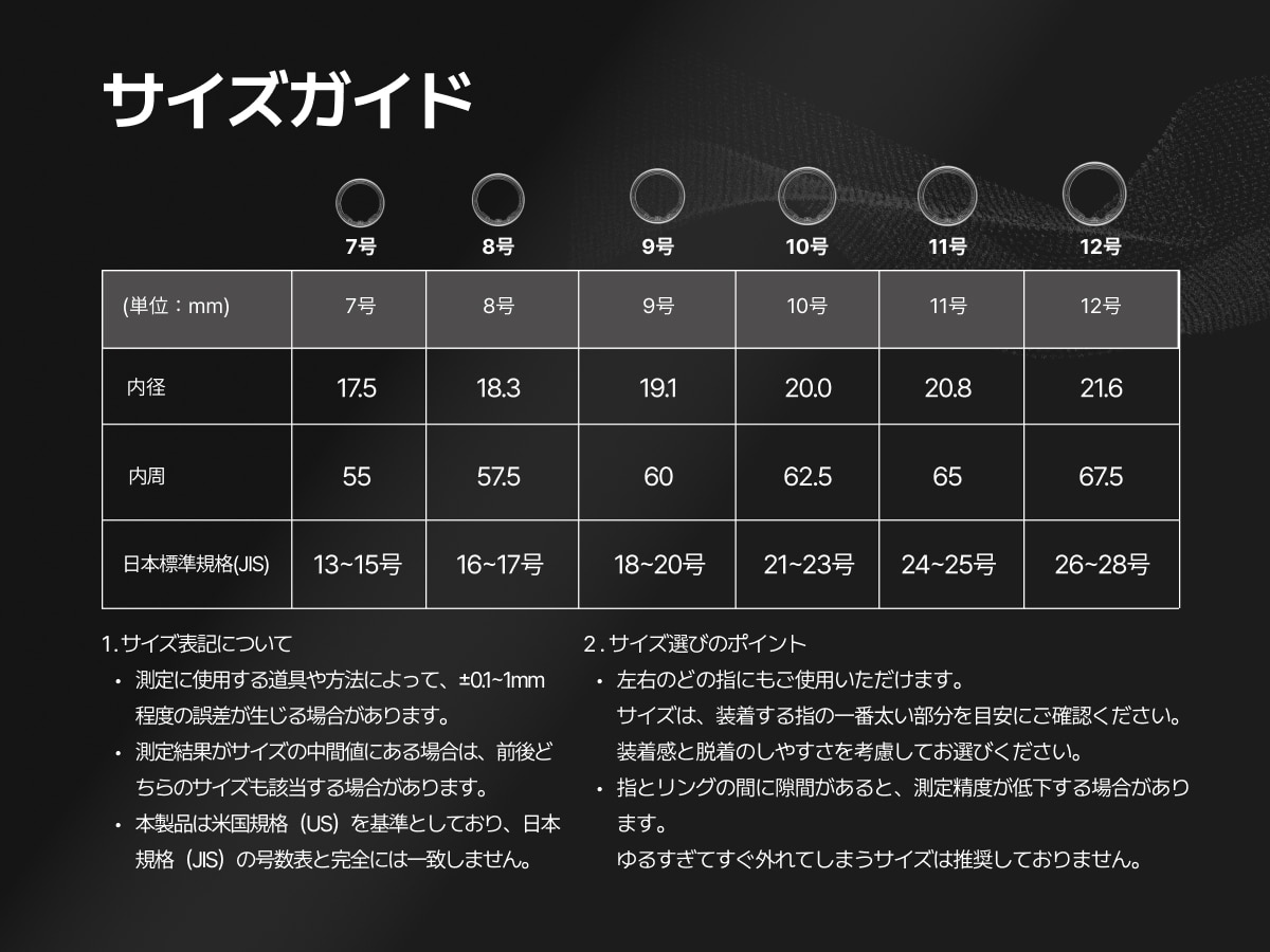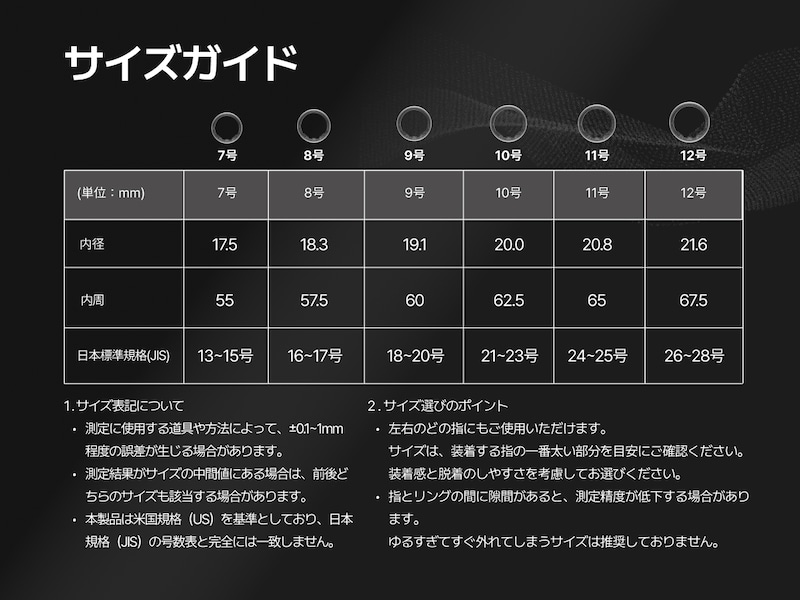 ●適応サイズ/Size7:約13~15号、Size8:約16~17号、Size9:約18~20号、Size10:約21~22号、Size11:約23~25号、Size12:約26~28号