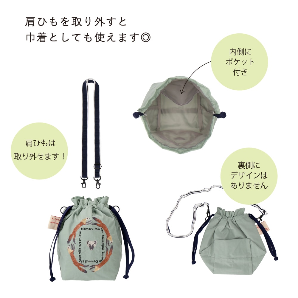 ●肩ひもを付けてショルダーポーチとして、取り外して巾着ポーチとしてお使いいただけます