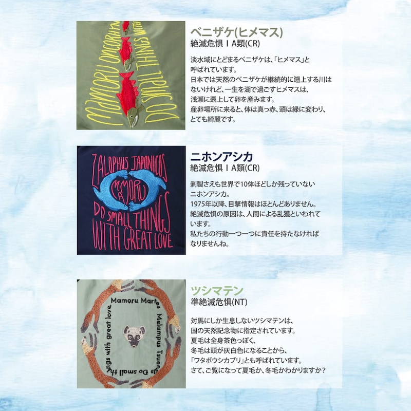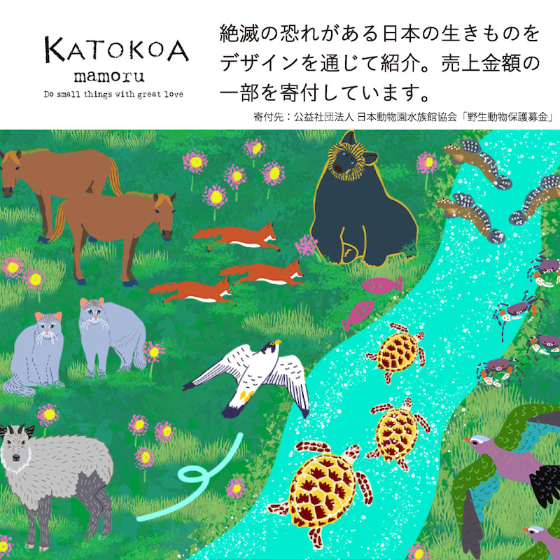 「KATOKOA mamoru」は、絶滅の恐れがある日本の生きものたちをデザインを通じてご紹介するブランドです。