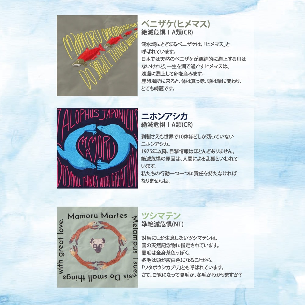 「KATOKOA mamoru」は、絶滅の恐れがある日本の生きものたちをデザインを通じてご紹介するブランドです。