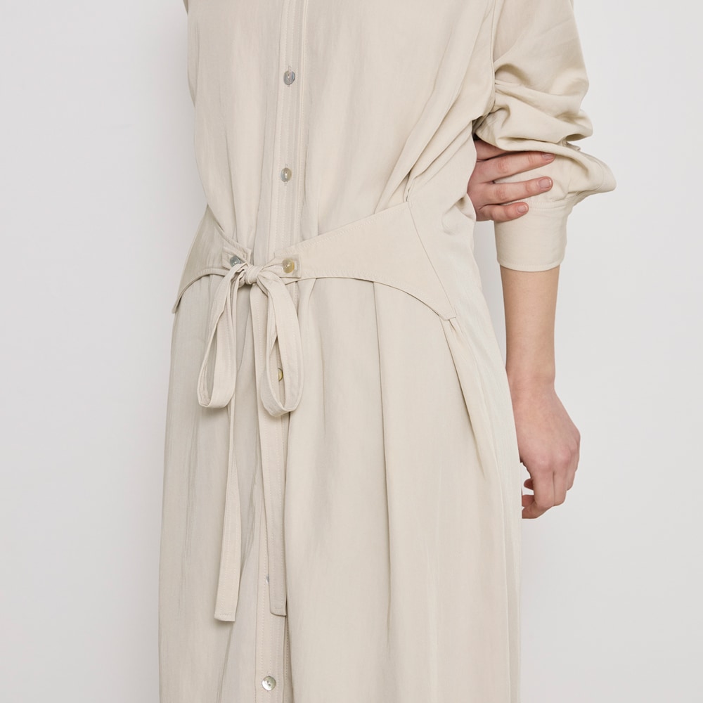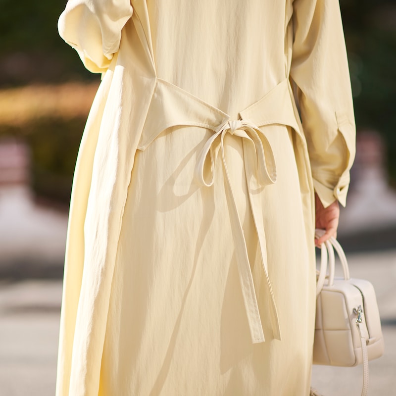 ・共生地のベルト付き。前で結んでウエストマークすれば女性らしいシルエットに、後ろで結べば軽やかな印象に。