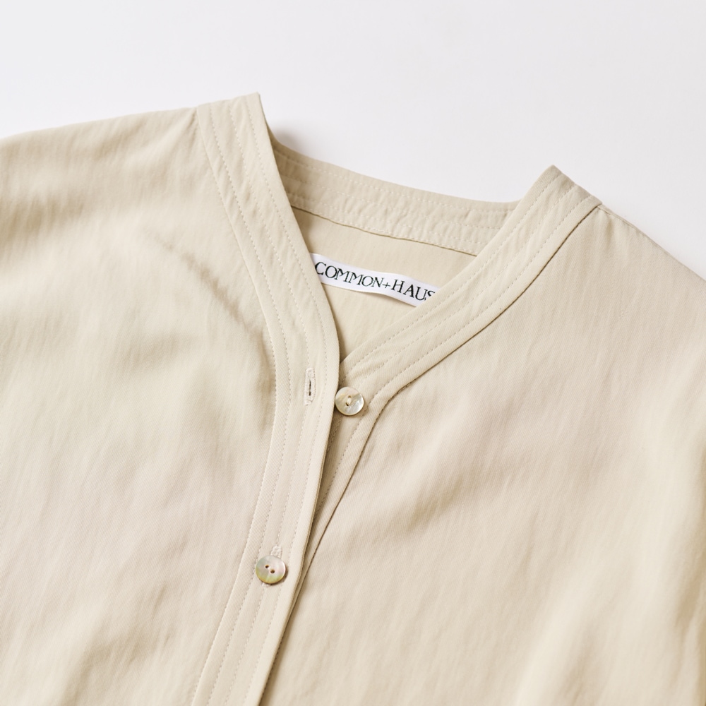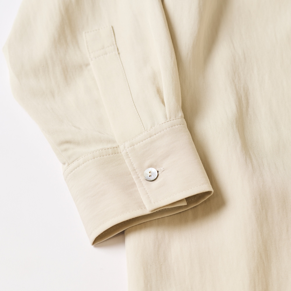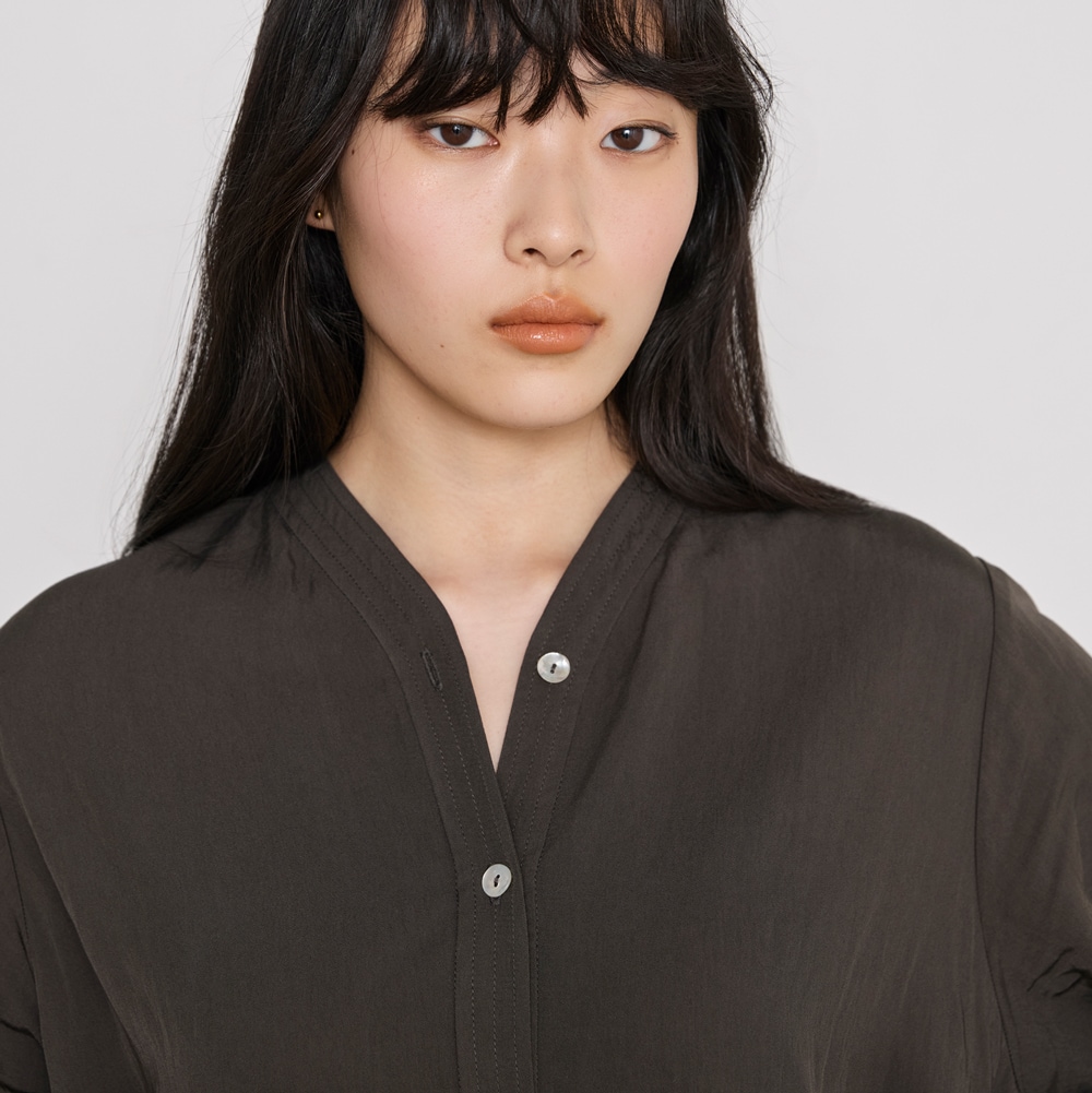・襟から前立てへと続く、一体型のネックデザイン。首元に自然に沿い、すっきりとした印象をつくる。