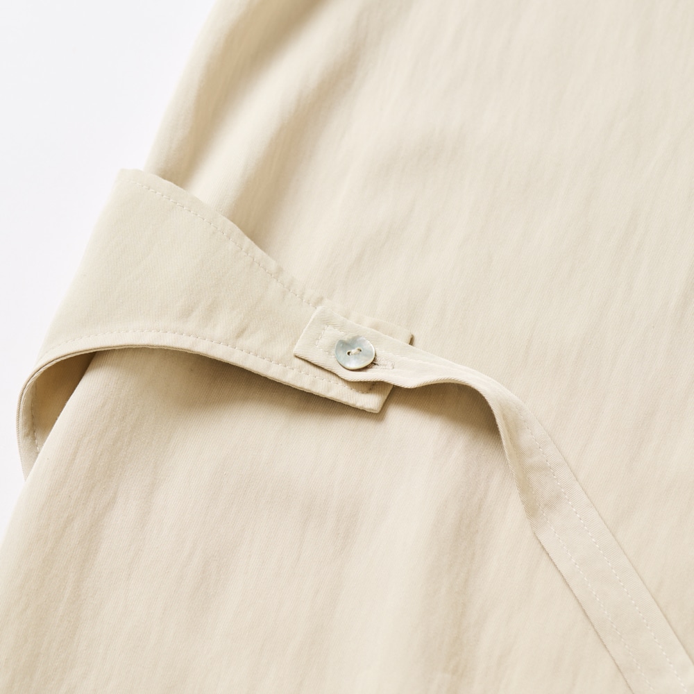 ・裾のボタンを外してアレンジも可能。パンツやデニムとのレイヤードスタイルも美しく決まる。