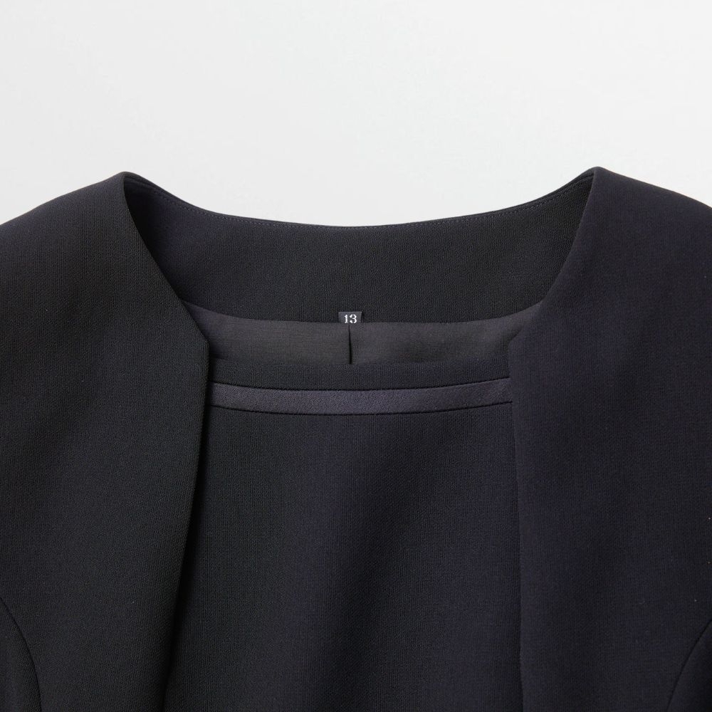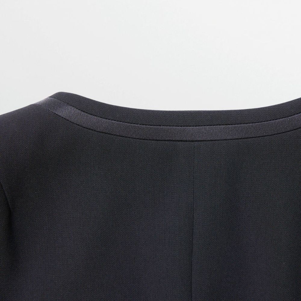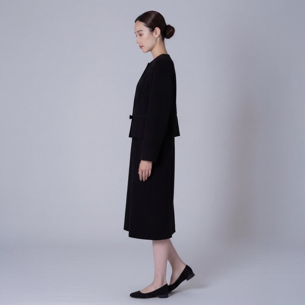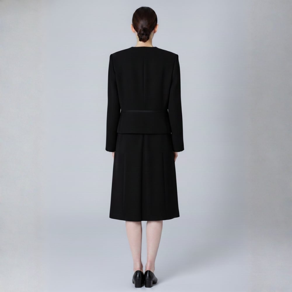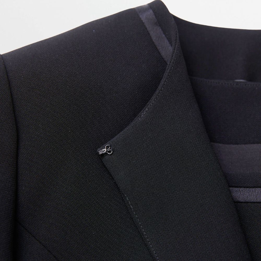 上品なノーカラーで洗練されたフォーマルスタイルを
