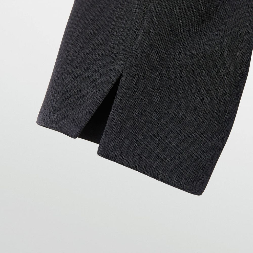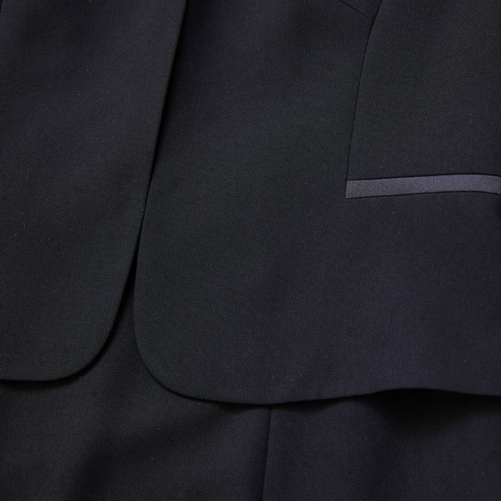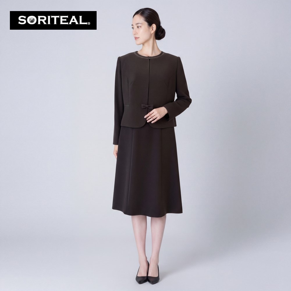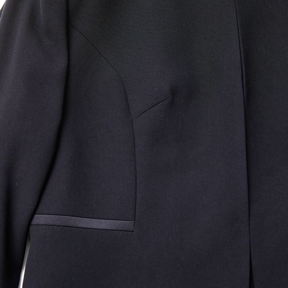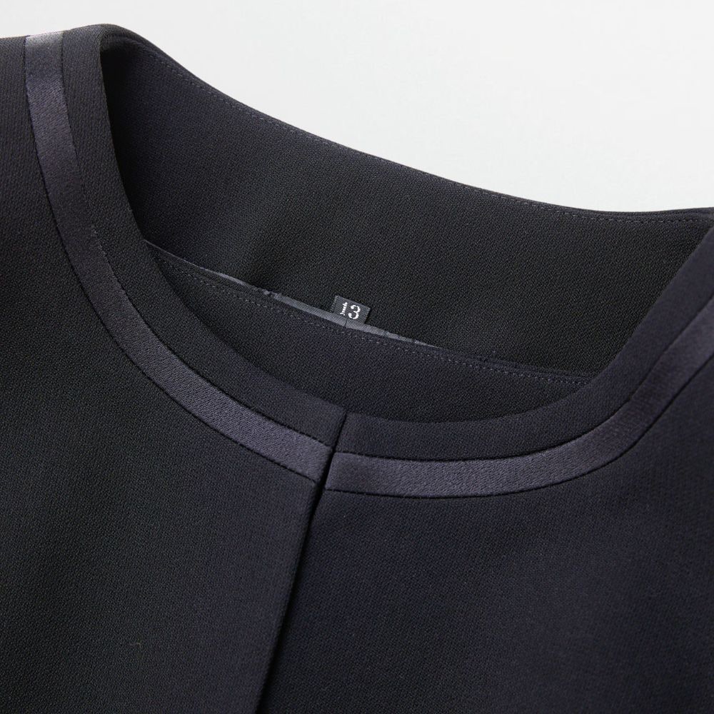 上品なノーカラーで洗練されたフォーマルスタイルを