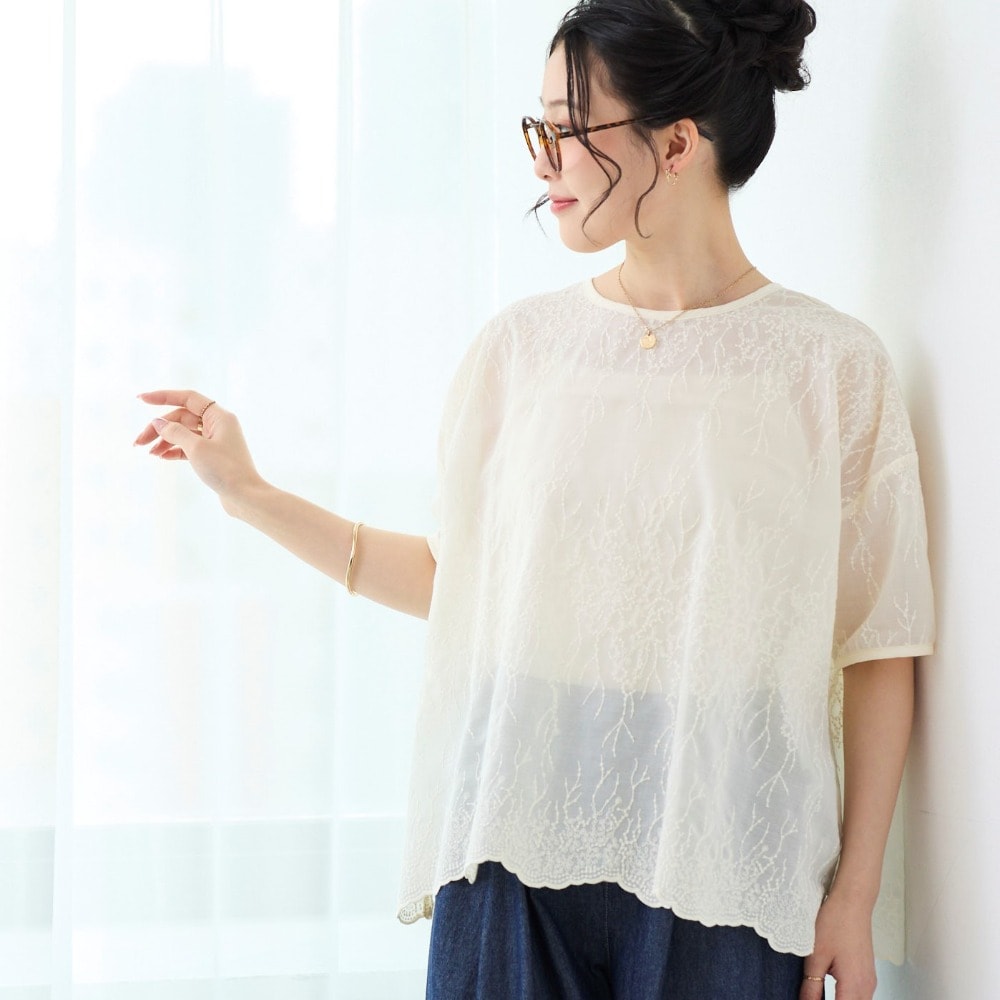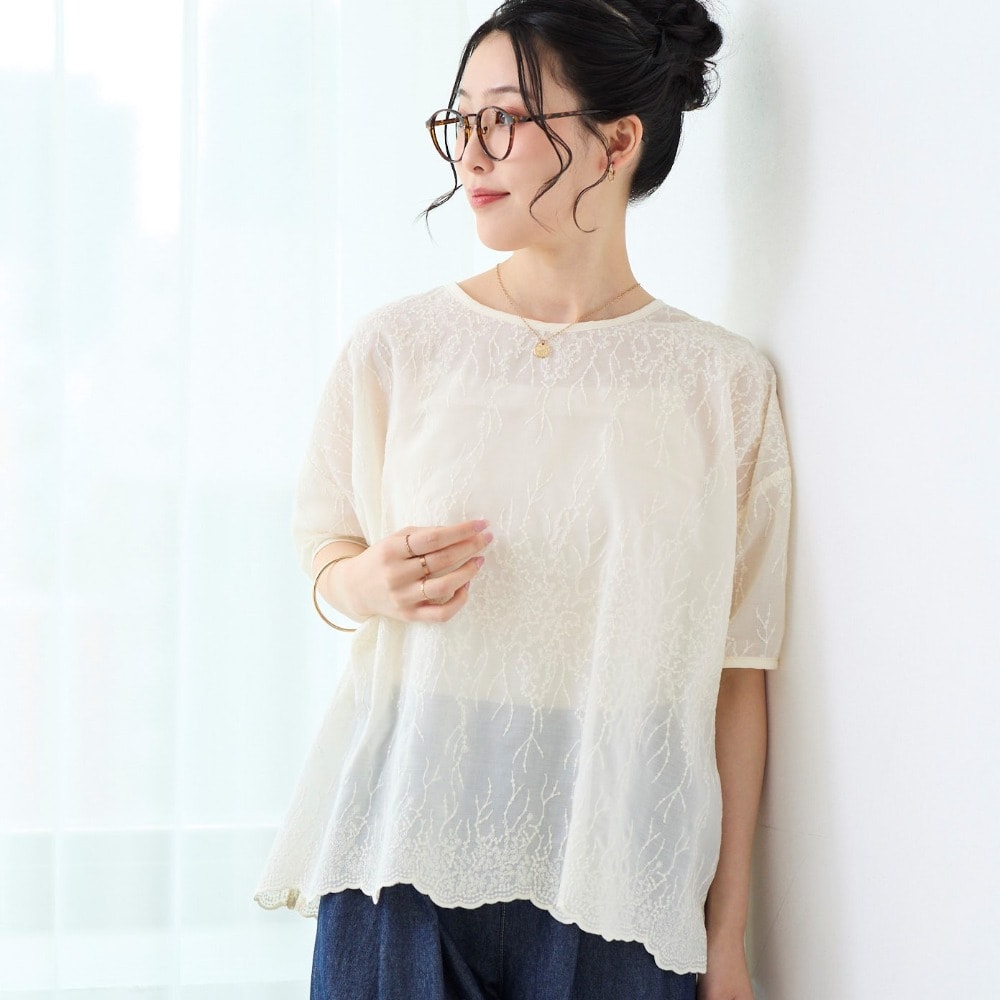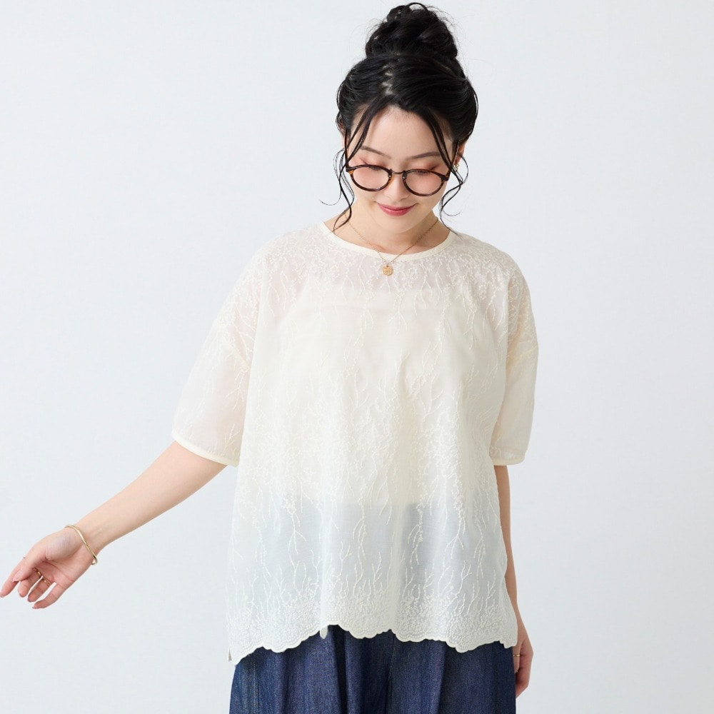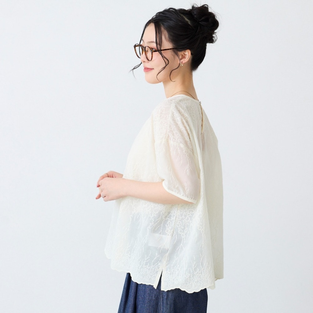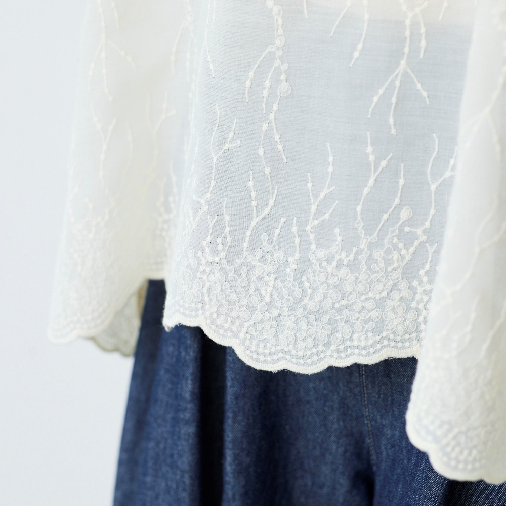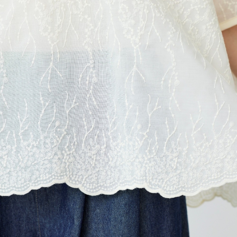 贅沢な総柄刺繍とスカラップが彩る大人ブラウス