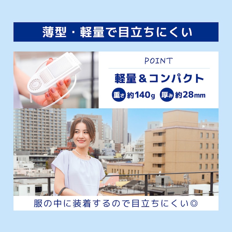 ●服の下に仕込める薄型・軽量設計。外出先でも周りの目を気にせず使えます